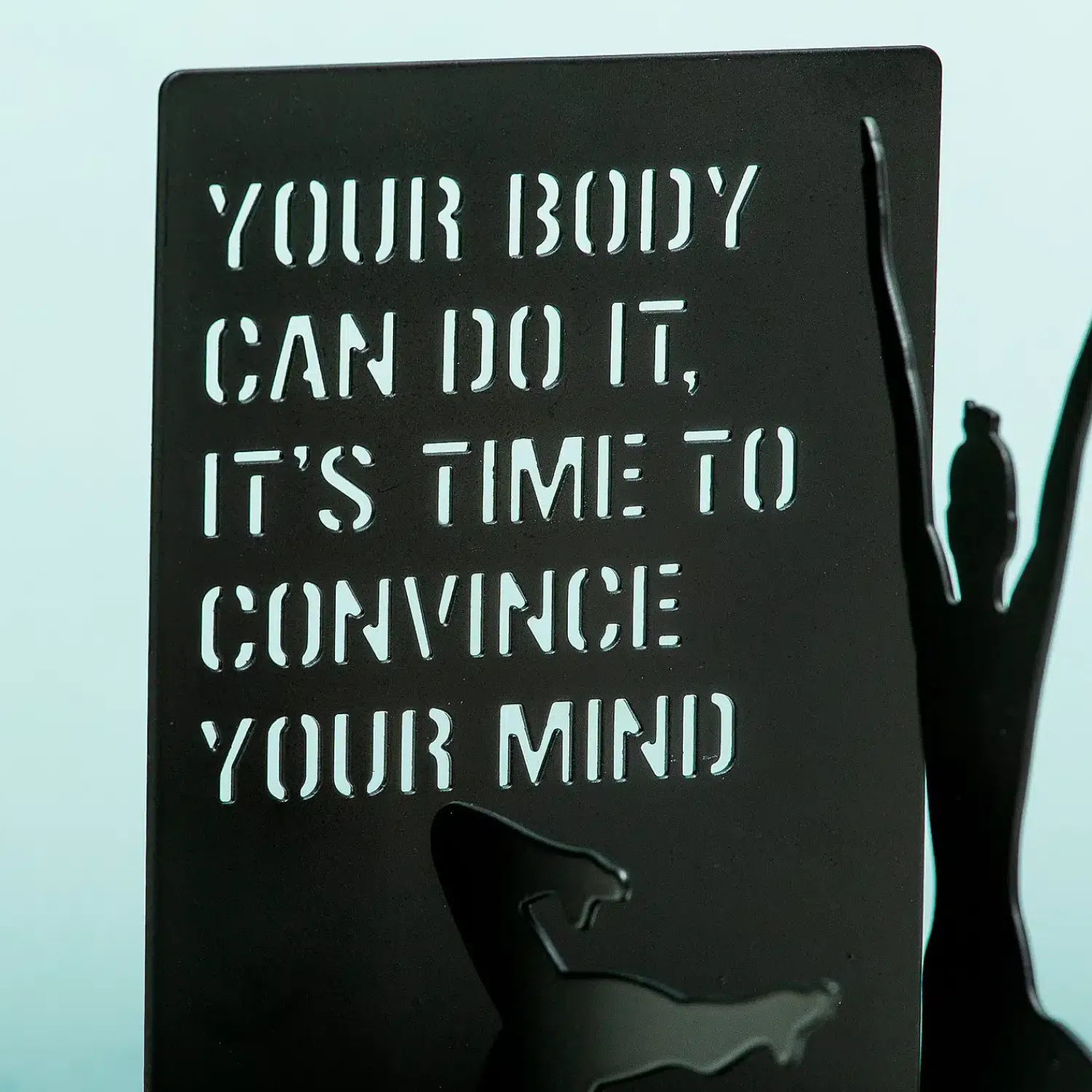 - Op de boekensteun staat de tekst: your body can do it, it’s time to convince your head