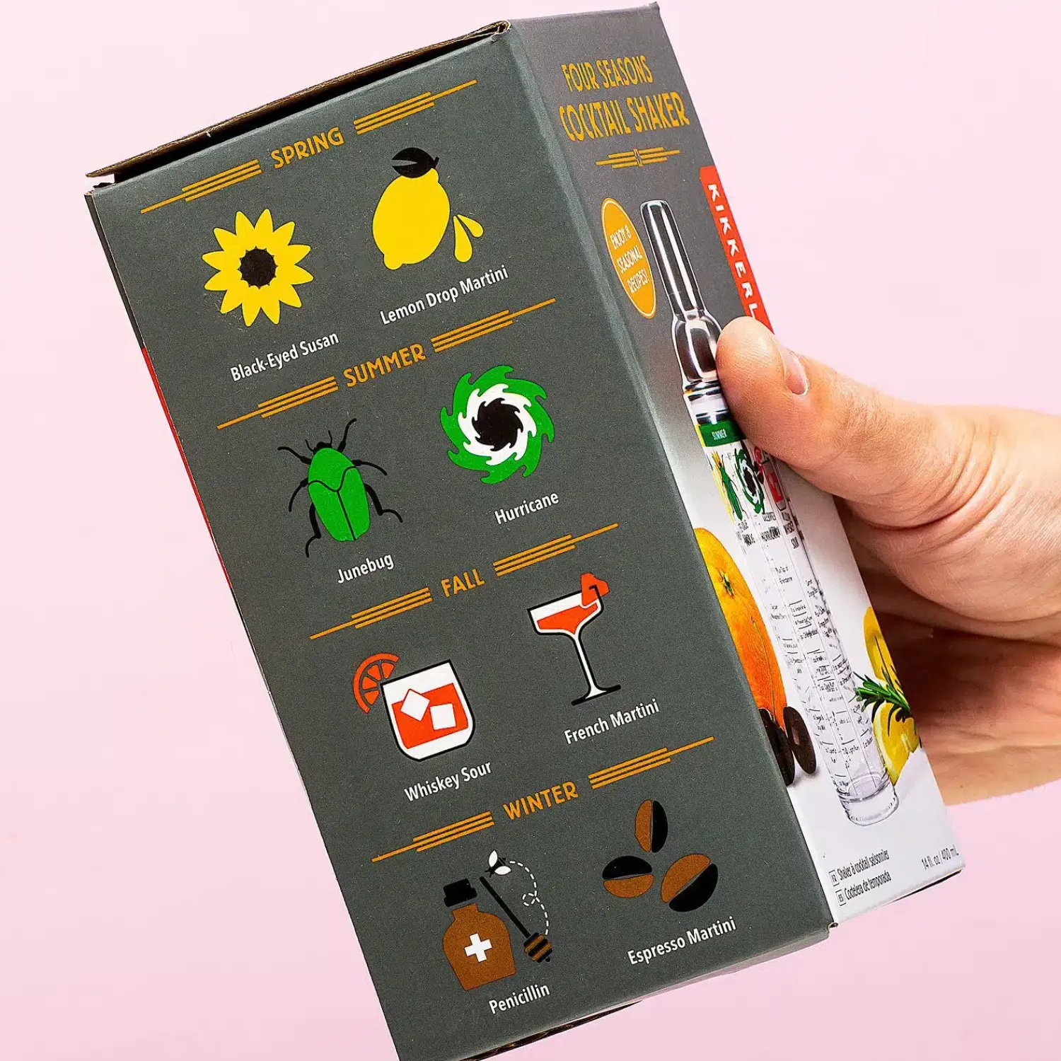 Lekker zelfs cocktails maken? Een fluitje van een cent met de Four Seasons cocktailshaker van Kikkerland. Op deze glazen shaker staan acht recepten: twee voor elk van de seizoenen. Zo maak je cocktails die perfect bij het seizoen passen. Een Hurricane cocktail bijvoorbeeld in de zomer, of een Black Eyed Susan in de lente. In het rvs deksel zit een strainer verwerkt, die alles wat je niet in je glas wilt hebben tegenhoudt.