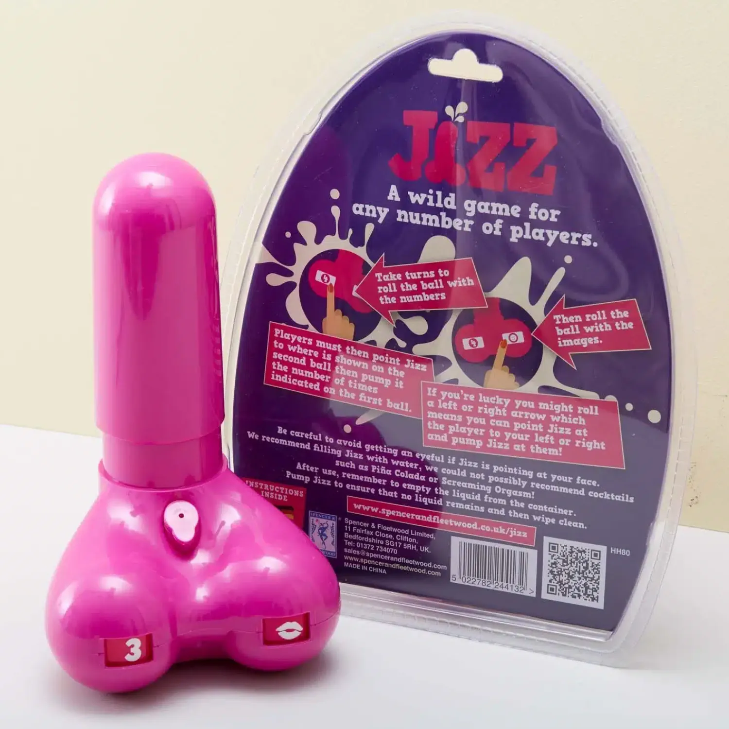 Oefen je skills met het Jizz piemel drankspel. Dit drankspel, in de vorm van een paarse piemel, is het ultieme foute, hilarische drankspel voor vrouwen. Eerst draai je een getal op de linkerbal, dan een lichaamsdeel op de rechterbal en vervolgens pomp je het benodigde aantal keren. En dat doe je ook nog eens terwijl je de paarse piemel op het aangewezen lichaamsdeel richt. Heb je mazzel, dan mag je richten op degene die naast je zit. Zoek je een baldadig spel voor een vrijgezellenfeest, dan heb je het met Jizz wel gevonden. We raden aan om het spel met water te spelen en vooral niet met een witte drank als Bailey’s of Piña Colada *wink-wink*.