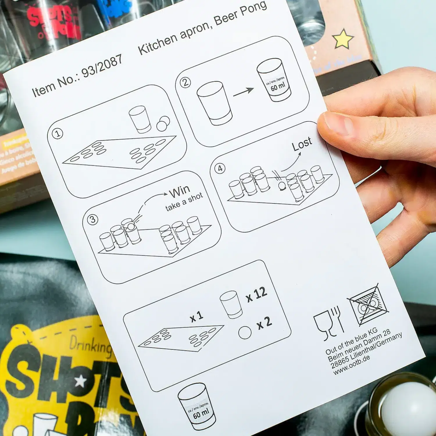 Is een beer pong tafel te groot voor je studentenkamer, maar wil je toch graag een leuke avond hebben? Speel dan het Shots Pong drankspel van Out of the Blue. Dit spelletje is geïnspireerd op beer pong, maar dan met shotglaasjes. Je krijgt twaalf shotglaasjes met rode en blauwe opdruk, twee balletjes en een speelveld.