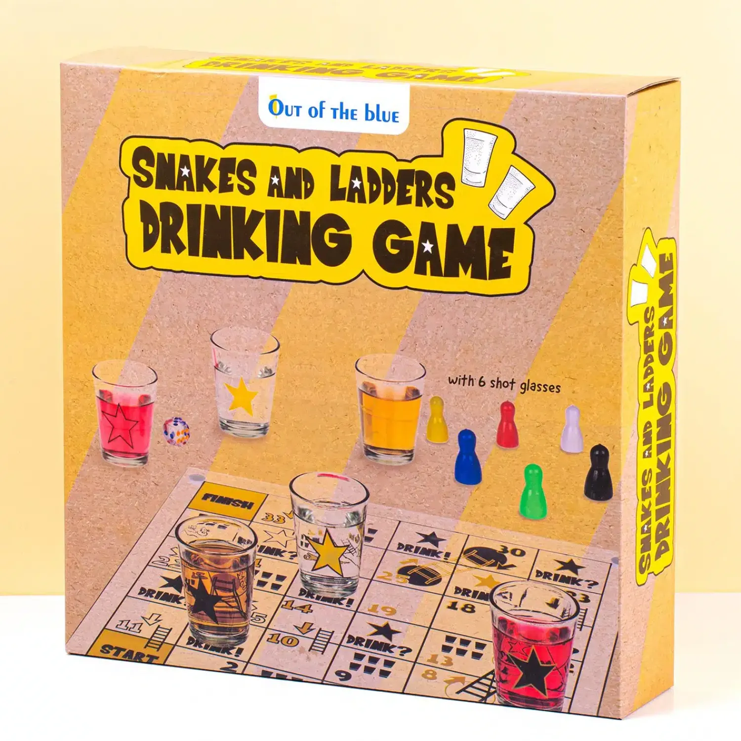 Zonder slangen, maar wel met ladders waar je vanaf kunt vallen: dat is het Slangen en ladders drankspel van Out of the Blue. Een grappig drankspel dat is gebaseerd op Snakes & Ladders. Je kunt het spelletje met in totaal zes mensen spelen: iedereen krijgt zijn eigen shotglaasje en spelfiguurtje. Ben jij als snelste bij de finish of val je van de ladder?