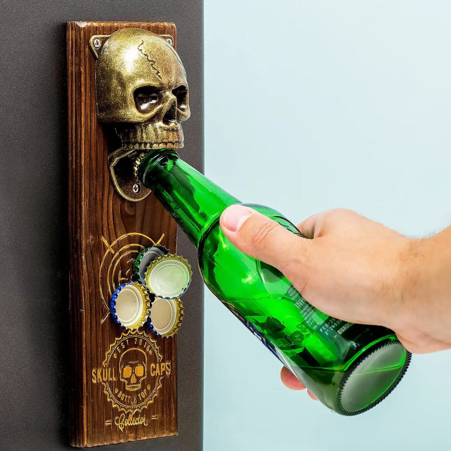 Zoek je een indrukwekkende manier om flesjes bier te openen als je vrienden op bezoek zijn? Dan is de Schedel magnetische flesopener van Gift Republic misschien iets voor jou. Deze stoere bieropener bestaat uit een schedel die je flesje opent met zijn mond en is gemonteerd op een houten achterplaat met magneet. Hierdoor kun je de flesopener op elk metalen object ophangen én vangt hij de bierdopjes op. Leuk voor in de keuken, in de tuin of in je eigen bar.