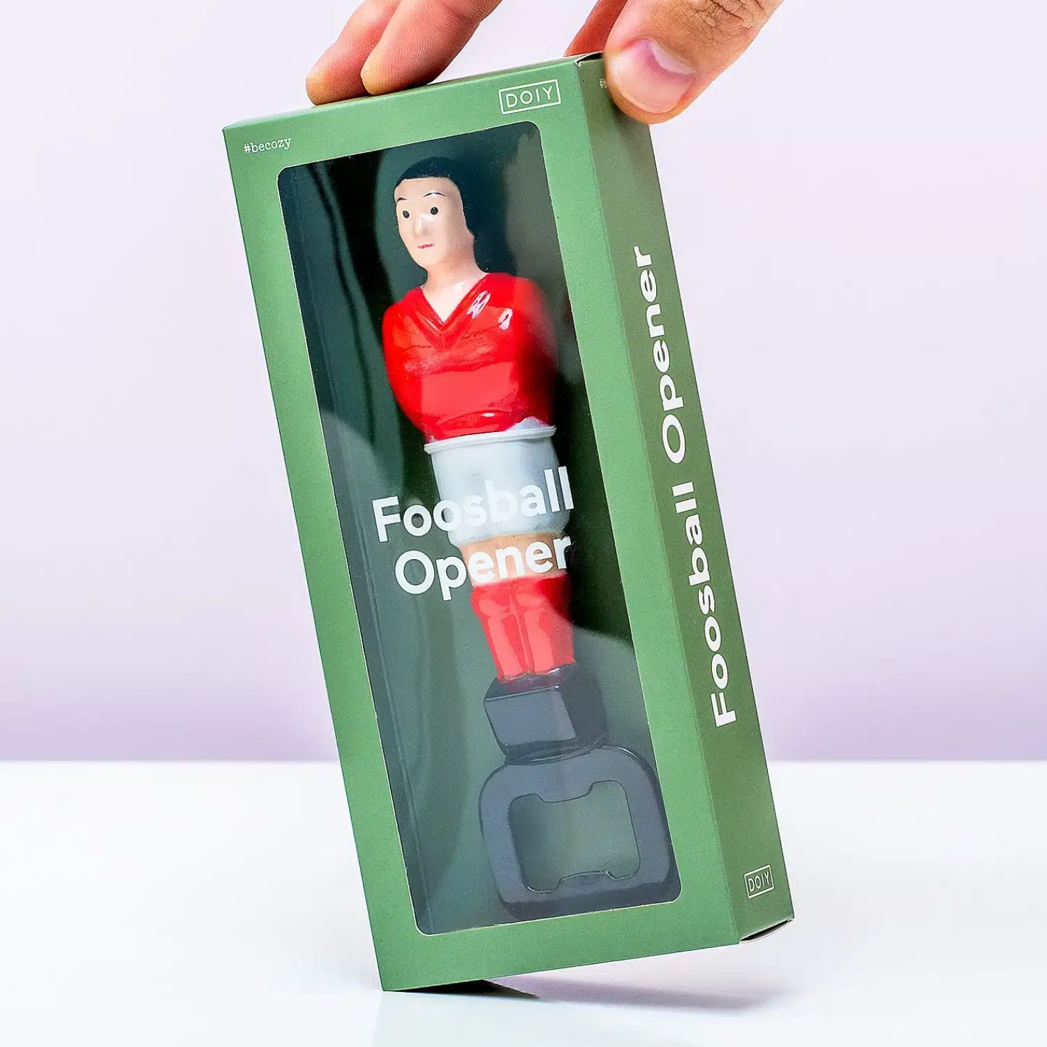 Deze unieke flesopener was ooit een waardige speler van een potje tafelvoetbal, maar overweegt na een blessure een nieuwe carrière. Eentje als bieropener. De Foosball flesopener van DOIY is speciaal gemaakt voor iedereen die dol is op voetbal en foosball. Hij opent elke fles terwijl jij met je vrienden naar een voetbalwedstrijd kijkt. De speler draagt een voetbaltenue en bij zijn voeten zit de flesopener. Een origineel cadeautje!