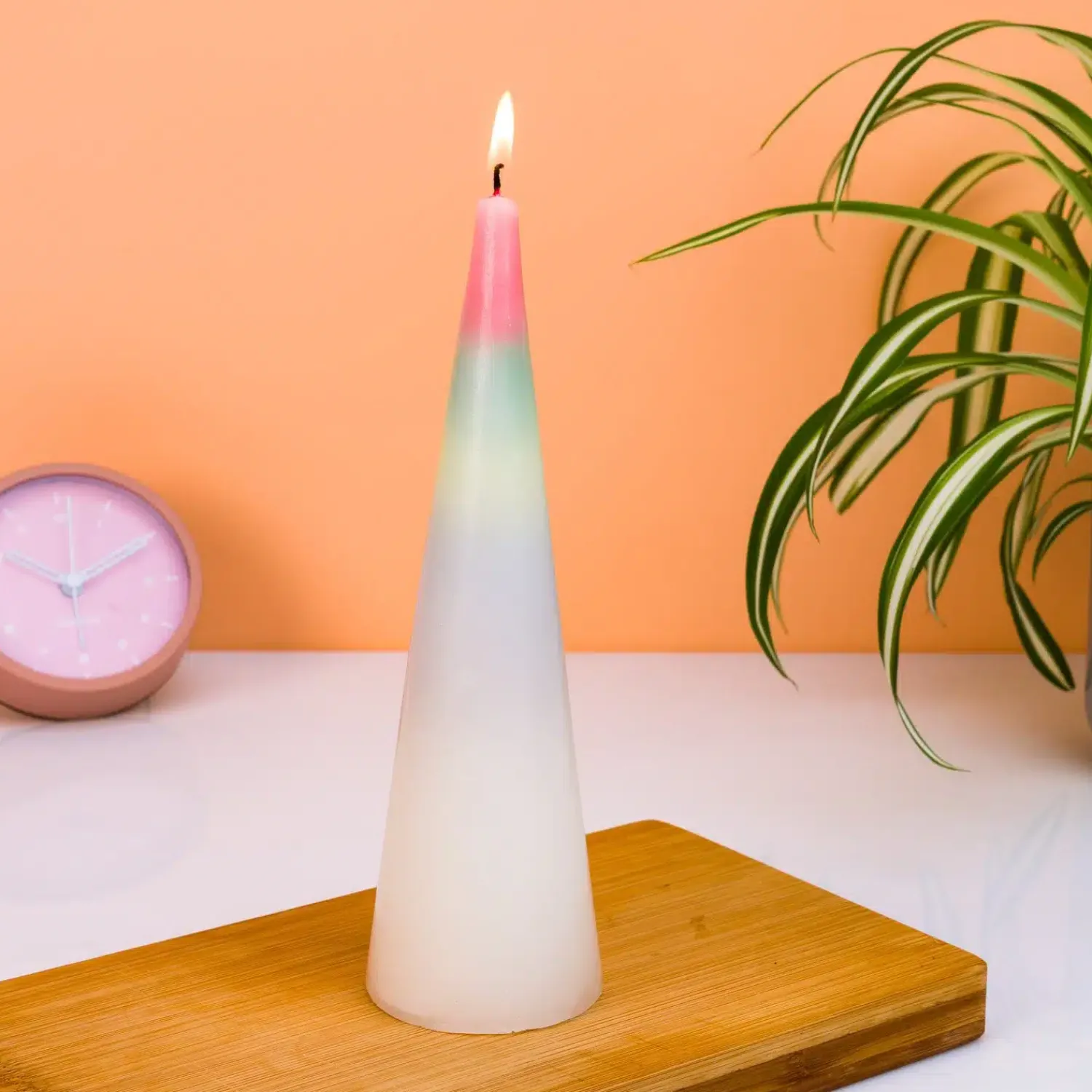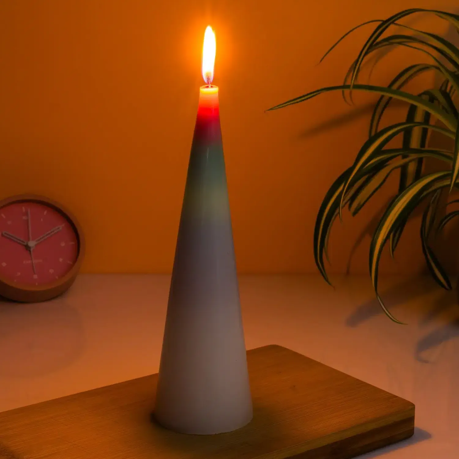 Als je wilt weten hoe een eenhoorn eruit ziet als hij smelt, steek dan de Kegelvormige regenboog druipkaars van Bitten aan. De kaars lijkt wit, maar aan de binnenkant zitten allemaal kleurtjes. De tuimelen over elkaar heen tijdens het branden van de kaars, waardoor er een soort gesmolten eenhoorn ontstaat. Een vrolijke kaars, die het ook goed doet als housewarmingcadeau!