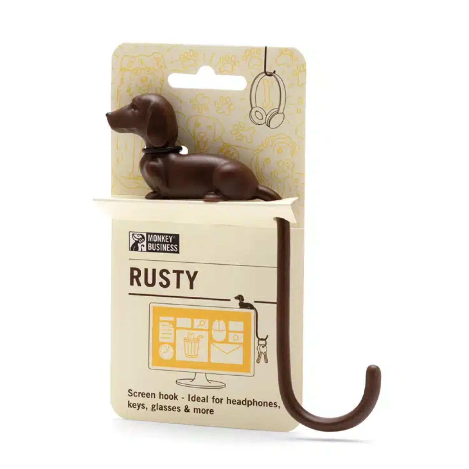 Is je bureau een chaos van kabels en accessoires? Rusty helpt je! Bevestig deze schattige hond aan je computerscherm en gebruik zijn staart als haakje voor je koptelefoon of opladers: alles wat je binnen handbereik wilt hebben. Of hang hem in de hal op een plankje, zodat je nooit meer je sleutels kwijt bent. Een handig cadeau voor iedereen met een rommelig bureau!