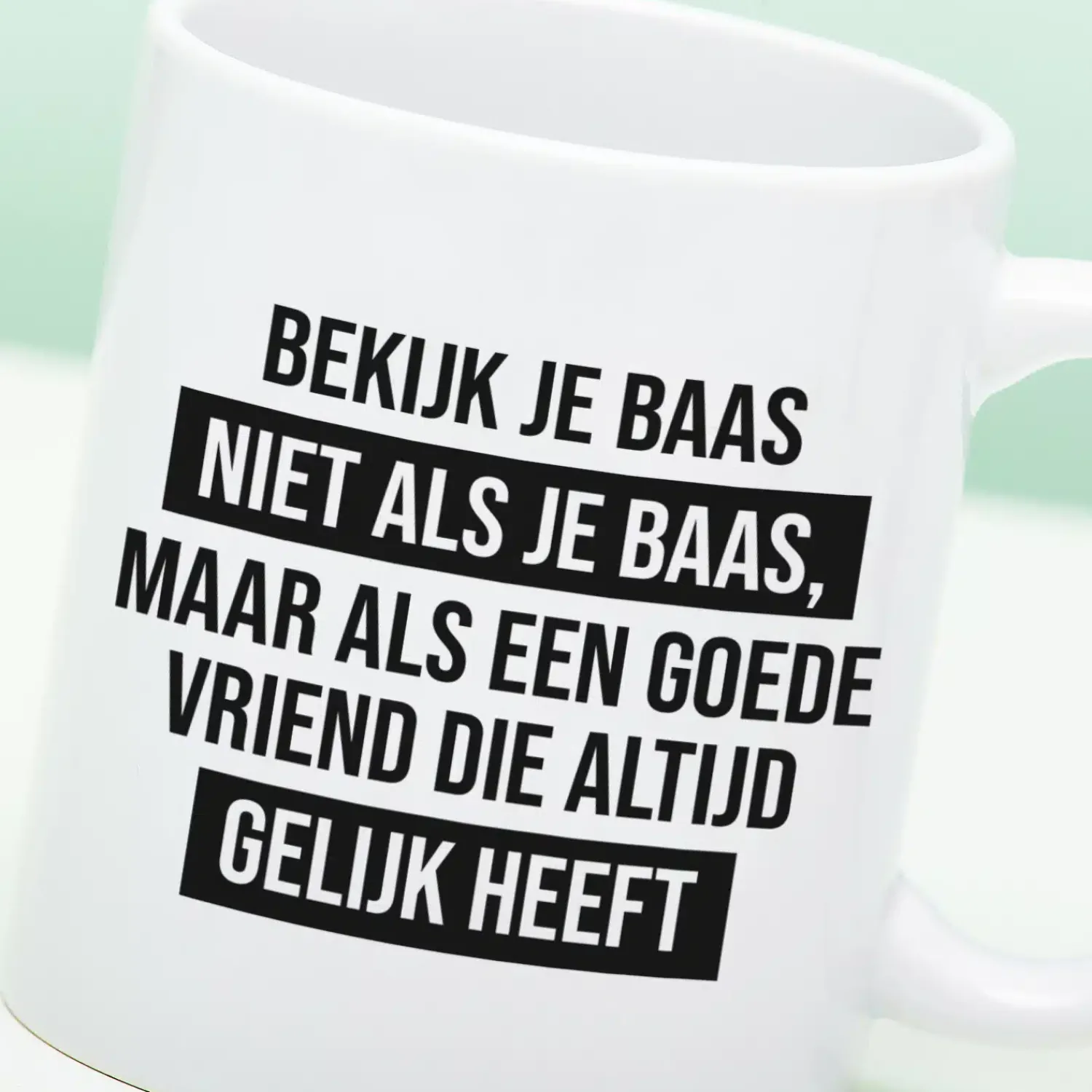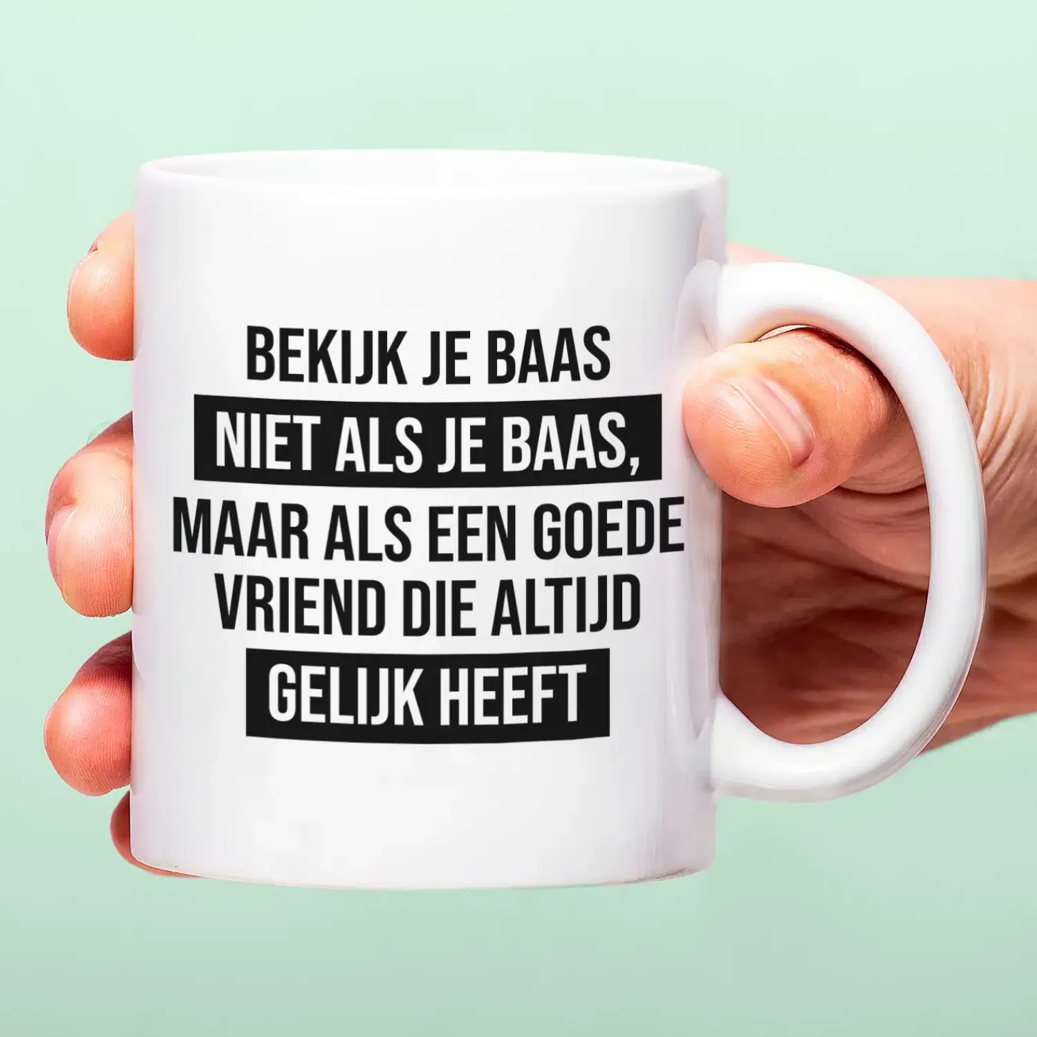 Je kunt zeggen wat je wilt, uiteindelijk is het je werkgever die de beslissingen neemt. Frustreert je dit soms? De Mok Bekijk je baas niet als je baas helpt je daarmee om te gaan. Op de beker staat de relativerende tekst: Bekijk je baas niet als je baas, maar als een goede vriend die altijd gelijk heeft. Elke keer als je boos wordt, drink je gewoon lekker wat koffie en denk je: wat heb ik toch irritante vrienden.