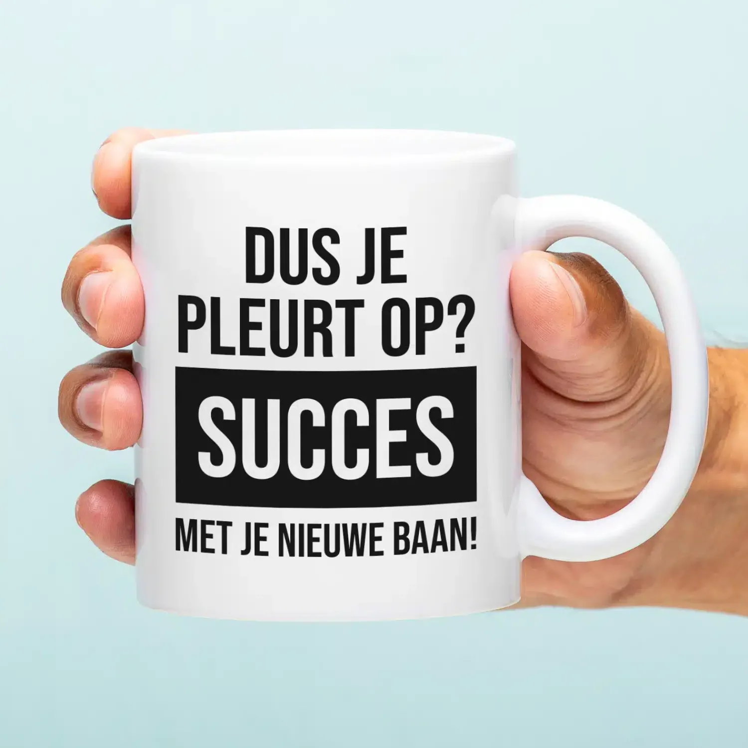 De Mok Dus je pleurt op? is het perfecte cadeautje voor een collega die vertrekt. Met de tekst Succes met je nieuwe baan! geef je een originele en grappige herinnering mee.