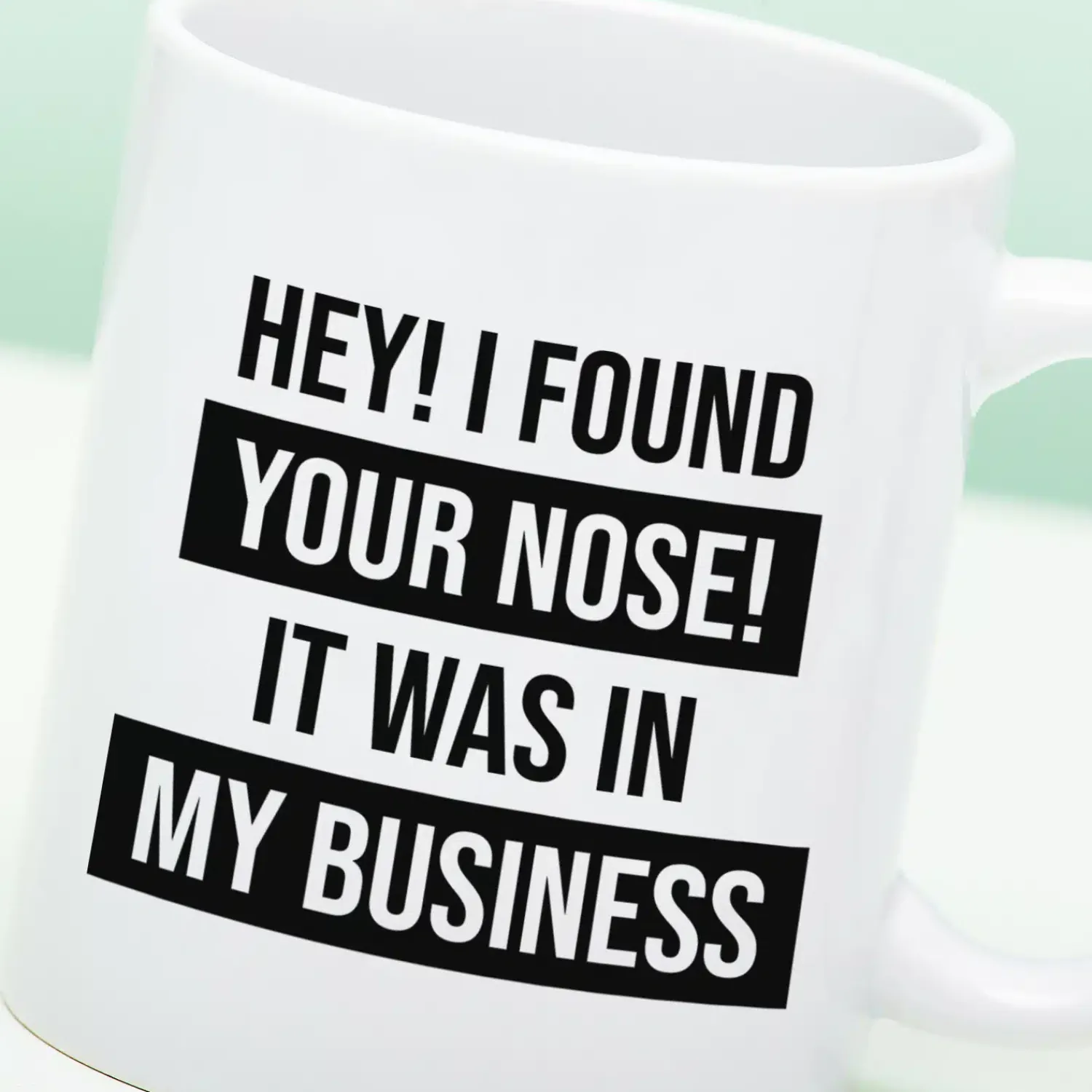 Heb je een bemoeizuchtige collega die altijd allerlei persoonlijke vragen stelt? Misschien wordt dat minder als je de Mok I Found Your Nose In My Business gebruikt. Op deze mok staat de tekst: Hey! I found your nose! It was in my business. Ook leuk als niet zo subtiel cadeautje voor tantes en anderen die zich echt teveel met jouw leven bemoeien.