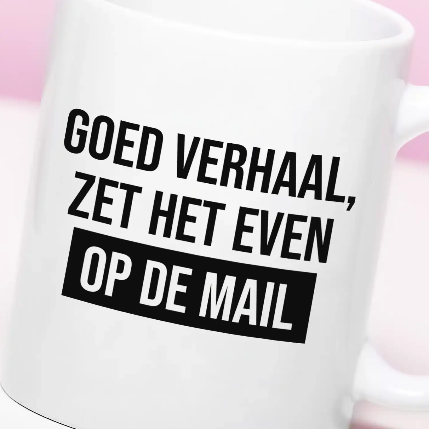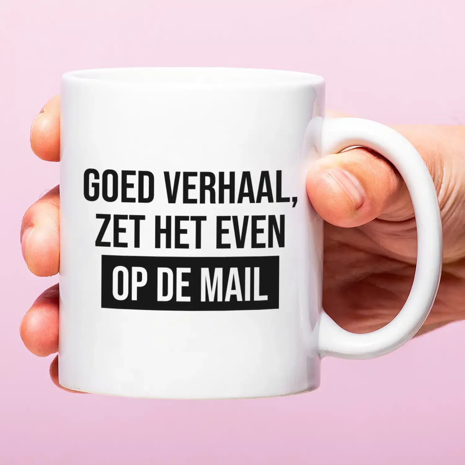 Wat is de makkelijkste manier om een werknemer of collega af te poeieren? Door ‘zet het even op de mail’ te zeggen. Met de Mok Zet het even op de mail hoef je dat niet eens te doen. Op de beker staat namelijk de tekst: Goed verhaal, zet het even op de mail. Komt er weer iemand aan je bureau zeuren? Drink een slok van je koffie terwijl je naar de tekst op de mok wijst. Heb je dat probleem ook weer opgelost.
