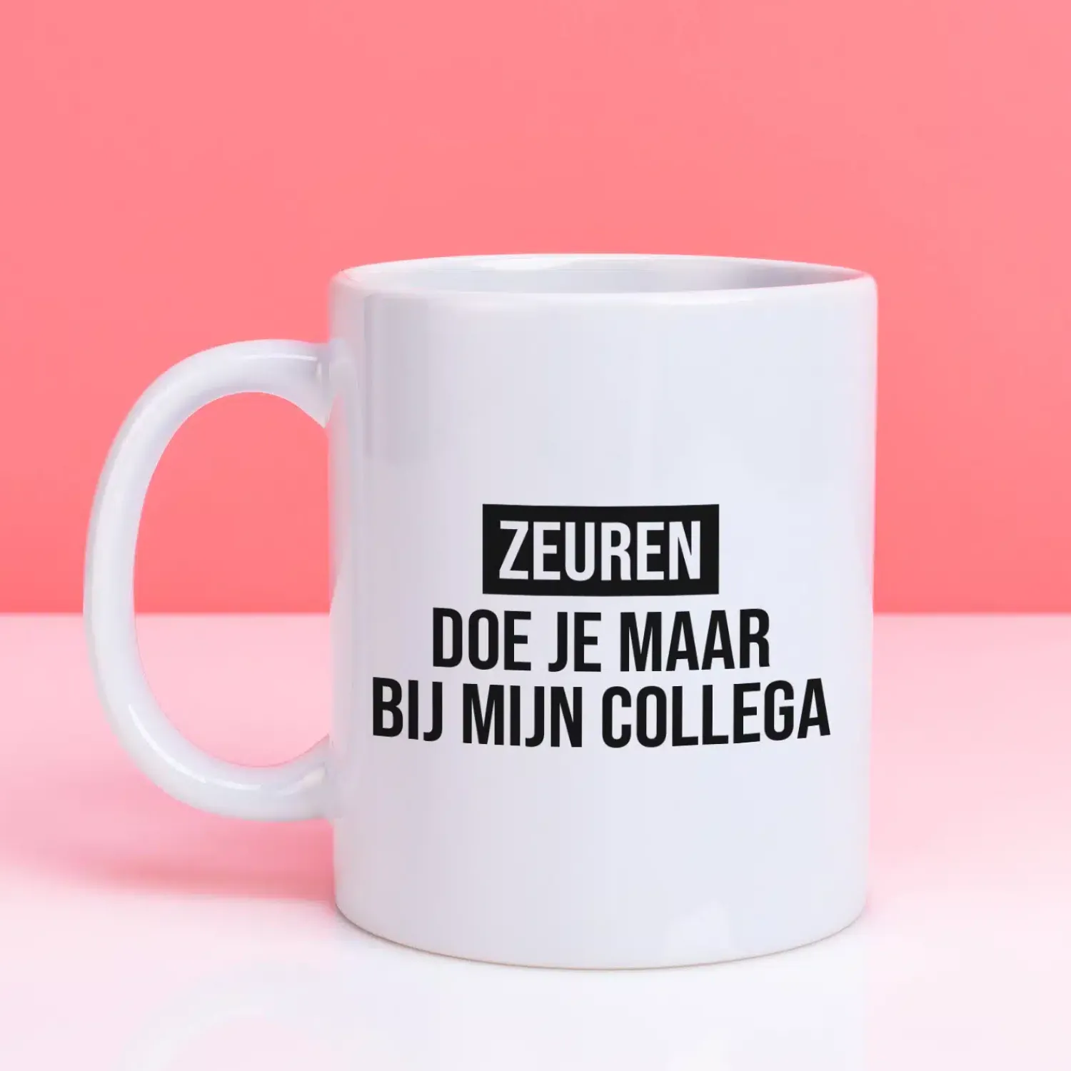 De Mok Zeuren doe je maar bij mijn collega is een grappige koffiemok voor kantoor. Ideaal om subtiel duidelijk te maken dat jij vandaag niet de aangewezen persoon bent voor gezeik.