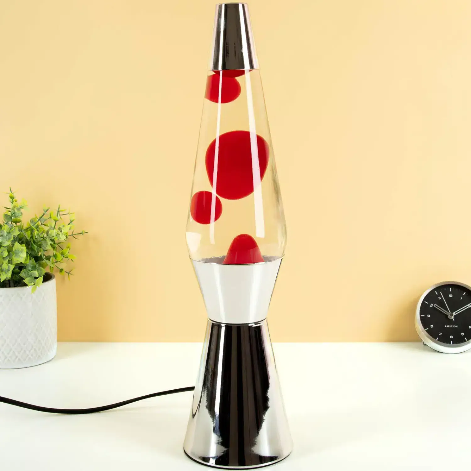 - Stoere lavalamp met zilverkleurige basis en rode lava