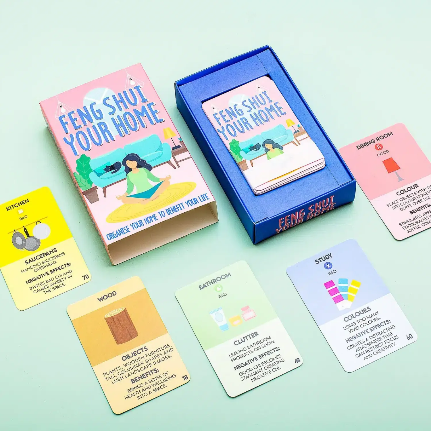 Vers fruit in je keuken, een aloë vera plant in je studeerkamer: de eeuwenoude filosofie feng shui leert je hoe inrichting en vormgeving invloed heeft op je leven. Met de Feng Shui Your Home kaarten van Gift Republic breng je meer feng shui in je interieur en welzijn in je leven. De set bevat honderd kaarten met praktische tips. Bijvoorbeeld hoe je je slaapkamer meer in balans kunt brengen om lekker te kunnen slapen.