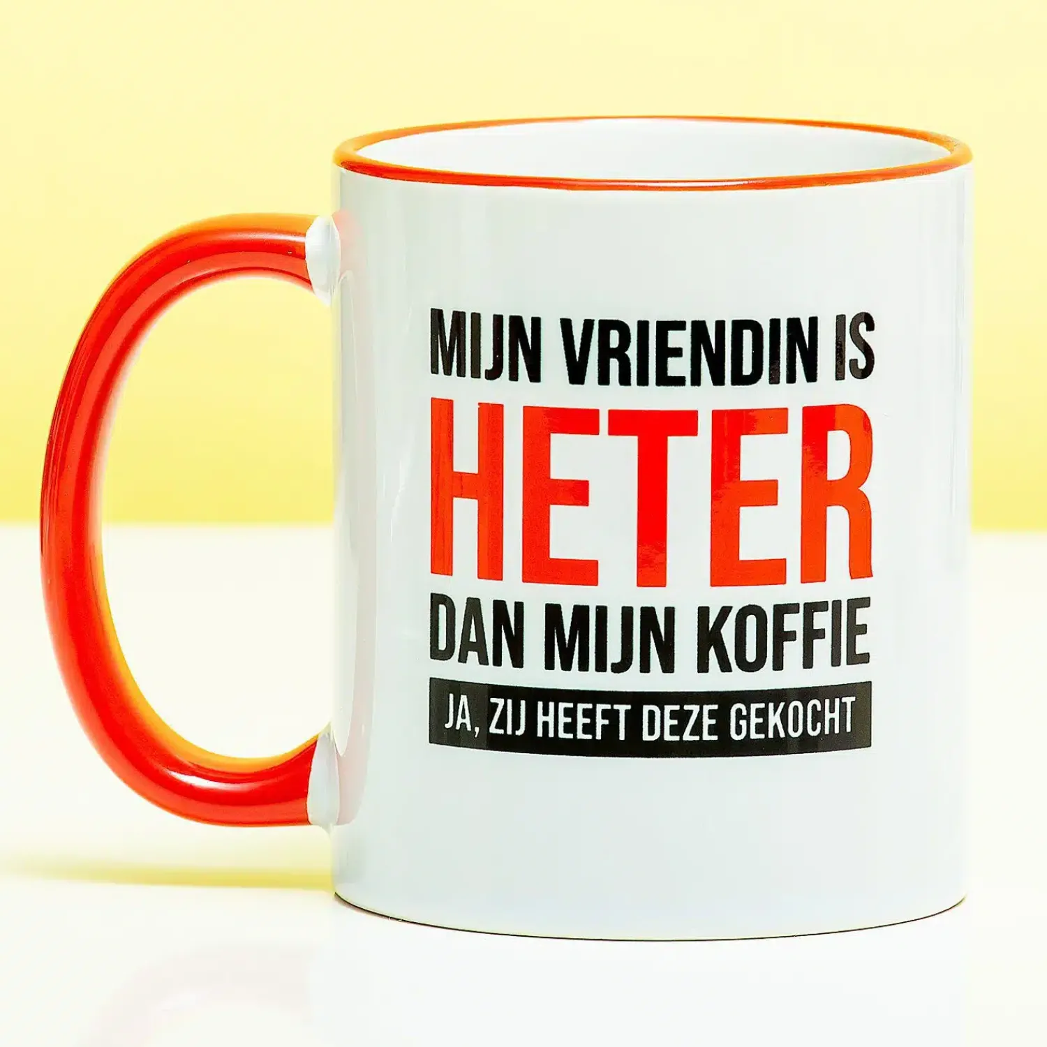 - Met de tekst: Mijn vriendin is heter dan mijn koffie. Ja, zij heeft deze gekocht.