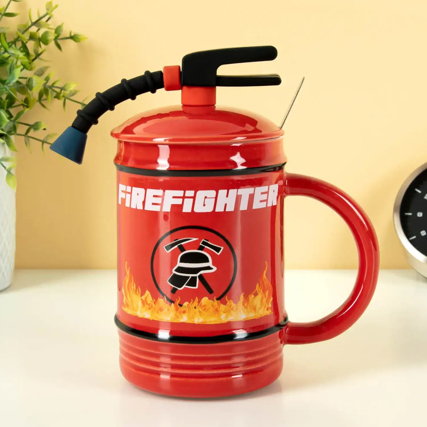 Als je bijna omkomt van de dorst, dan is er maar één oplossing: de Brandblusser mok gebruiken om je dorst te lessen. Deze unieke beker ziet eruit als een brandblusser: compleet met spuit op het deksel. Het is de perfecte mok voor fans van Chicago Fire, die graag een beker warme chocomel met slagroom willen leeglepelen. Of geef de beker aan één van de helden van je lokale (vrijwillige) brandweer of aan iemand die graag uit humoristische mokken drinkt.