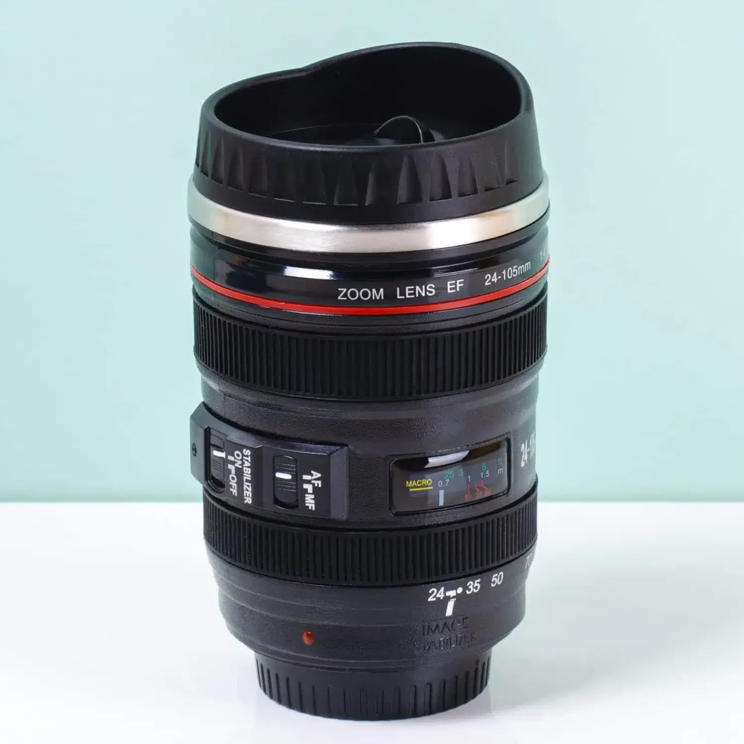 Voortaan drink jij je koffie met stralende glimlach. Je weet namelijk maar nooit wanneer je op de foto wordt gezet. De Cameralens mok is de leukste beker voor modellen en fotografen. Deze beker ziet eruit als een EF24-105 millimeter lens. Foto’s maken doet ‘ie niet, maar hij is prima geschikt om koffie en thee uit te drinken. Heb je een vriend die dol is op fotograferen en zoek je nog een leuk verjaardagscadeau voor hem? Geef hem de cameralens beker cadeau! De beker heeft een deksel met schroefdop.