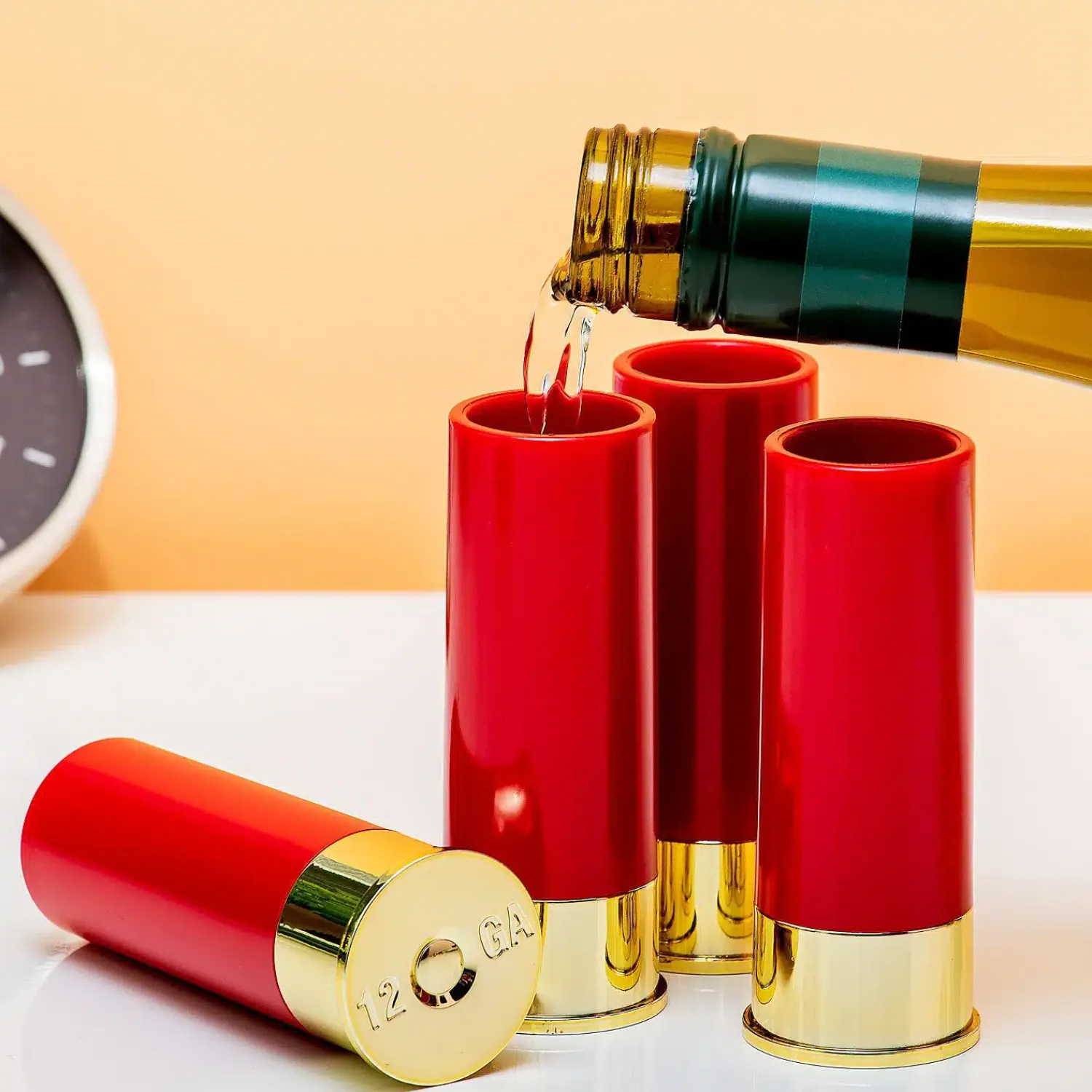 Bij een shotje denk je waarschijnlijk eerder aan een shot drank dan aan een shotgun. De Hagelpatroon shotglaasjes (set van 4) combineren de twee. Deze originele shotglaasjes zien eruit als een hagelpatroon. Ze lijken zo afkomstig te zijn uit een shotgun, maar wees gerust: er zijn geen kleiduiven gesneuveld om deze glaasjes te maken.