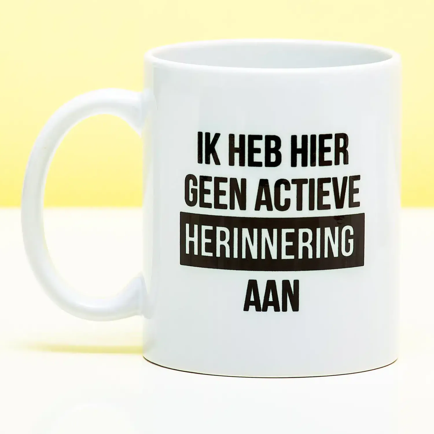 Je verantwoordelijkheid ontwijken? Dat doe je met de Mok Actieve herinnering. Op deze mok staat de tekst: Ik heb hier geen actieve herinnering aan. Een volkomen normale reactie om te ontkennen dat je bepaalde dingen hebt gezegd of gedaan.