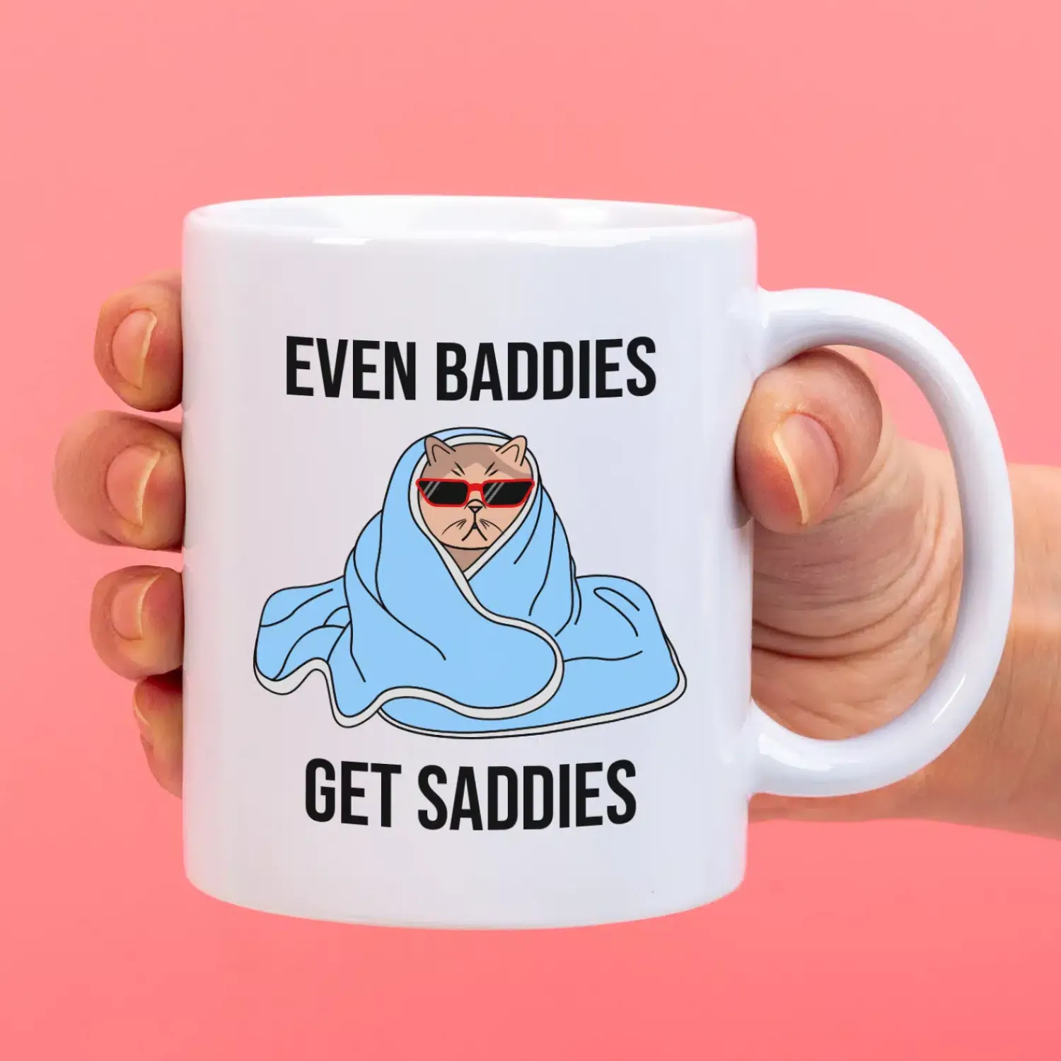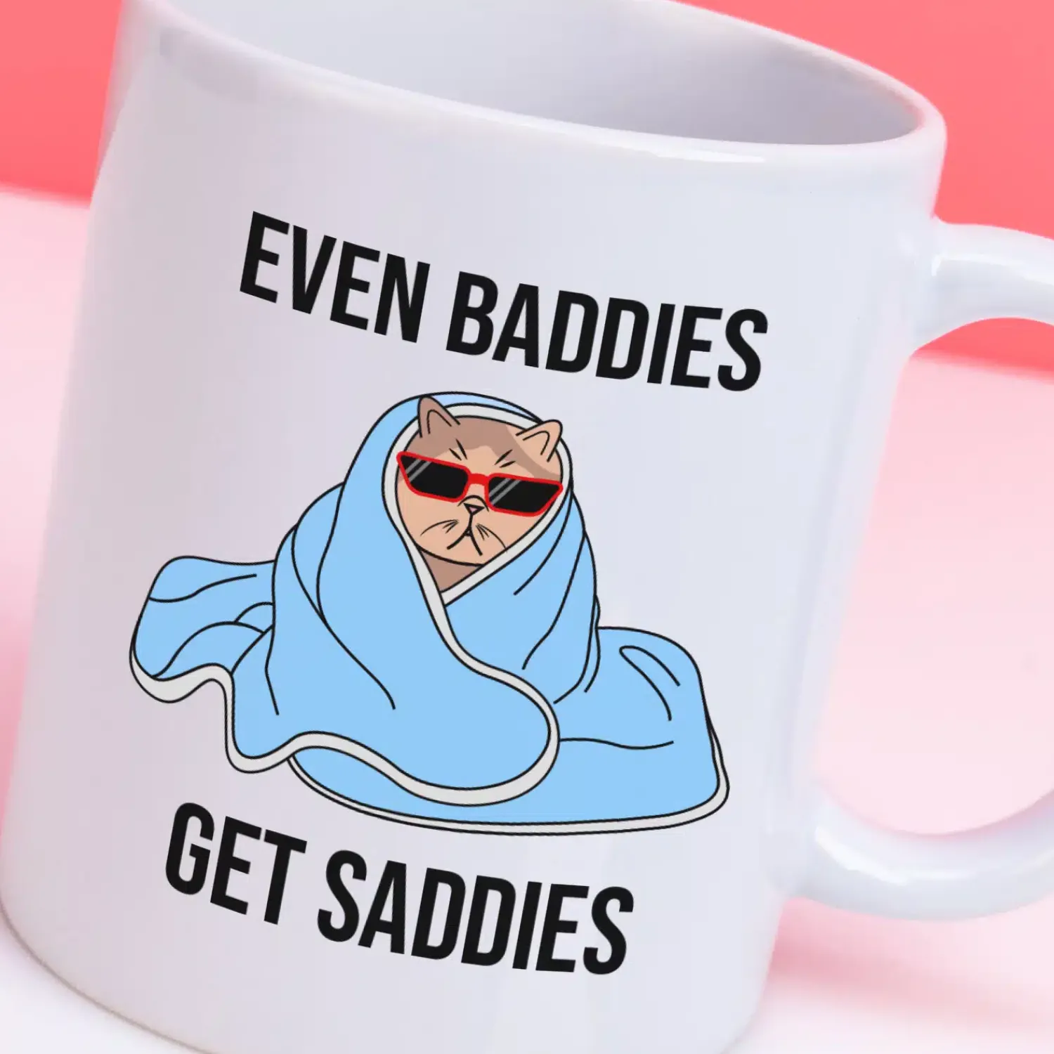 Meestal ben je een onverslaanbare baddie, maar heel af en toe zit jij er ook helemaal doorheen. Omdat alles tegen lijkt te zitten, je maar geen nieuw huis kan vinden of gewoon omdat je haar niet leuk wil zitten vandaag. Geniet van een lekkere kop koffie of thee om even bij te komen, uit de Mok Even baddies get saddies. Na het zien van de stoere kat voel jij je vast snel beter.