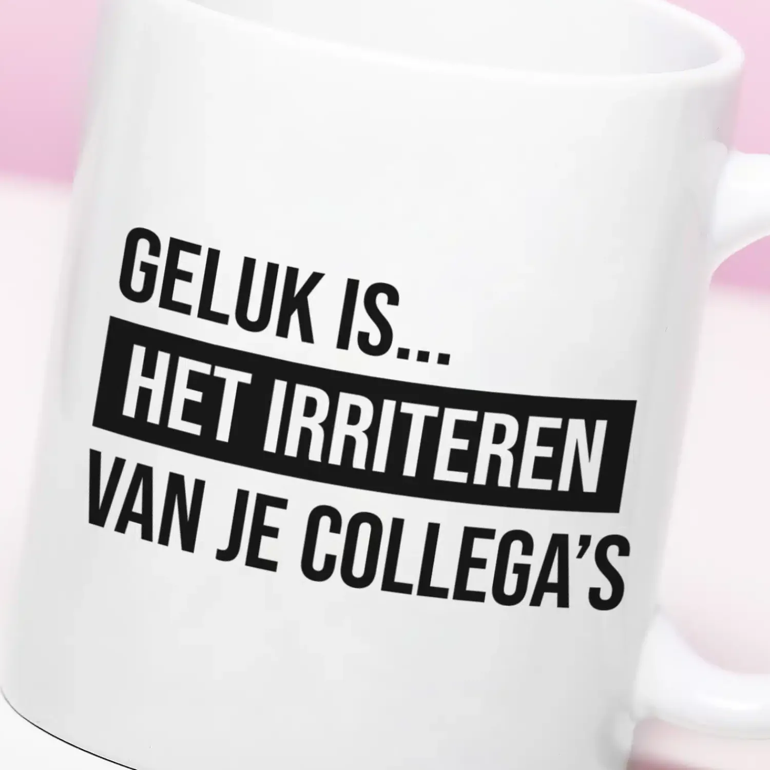 Je collega’s irriteren is hartstikke grappig en meestal kunnen ze het ook prima hebben. Al heb je natuurlijk af en toe ook een zeurpiet erbij. Drink je koffie voortaan uit de Mok Geluk is het irriteren van je collega’s en die zuurpruim weet direct dat jij niks om zijn mening geeft. Of geef de mok cadeau aan die ene collega, die je altijd met flauwe grapjes van het werk af houdt. Zal ‘ie blij mee zijn!