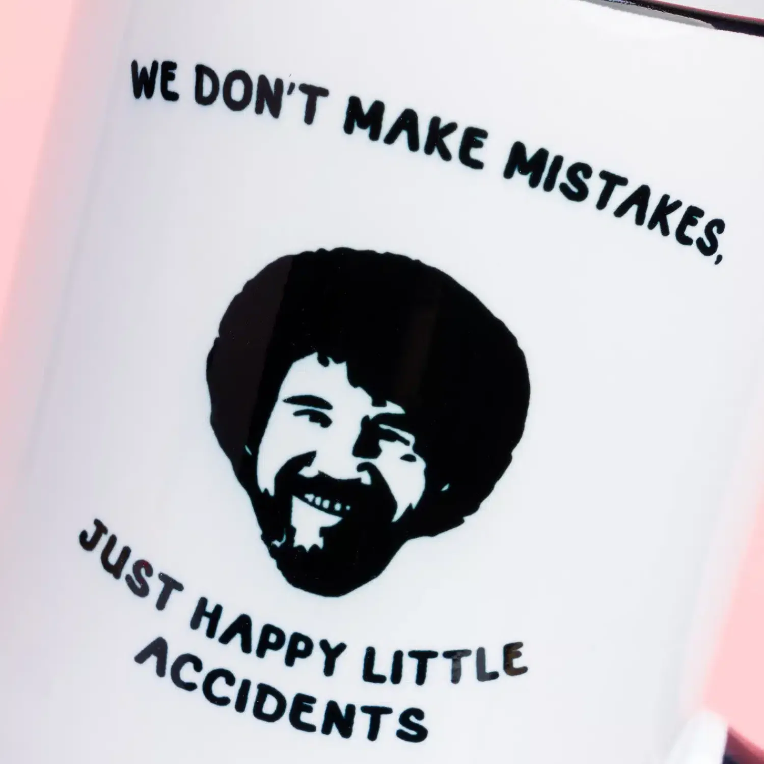 Als je kunstenaar Bob Ross met één woord moet beschrijven, dan kiezen wij voor positief. Want fouten kent hij niet, alleen kleine ongelukjes. De Mok Happy Little Accidents is een leuke mok voor iedereen die net zo positief in het leven staat, of dat graag wil. Op de beker staat een afbeelding van Bob Ross, met de tekst: We don’t make mistakes, just happy little accidents.