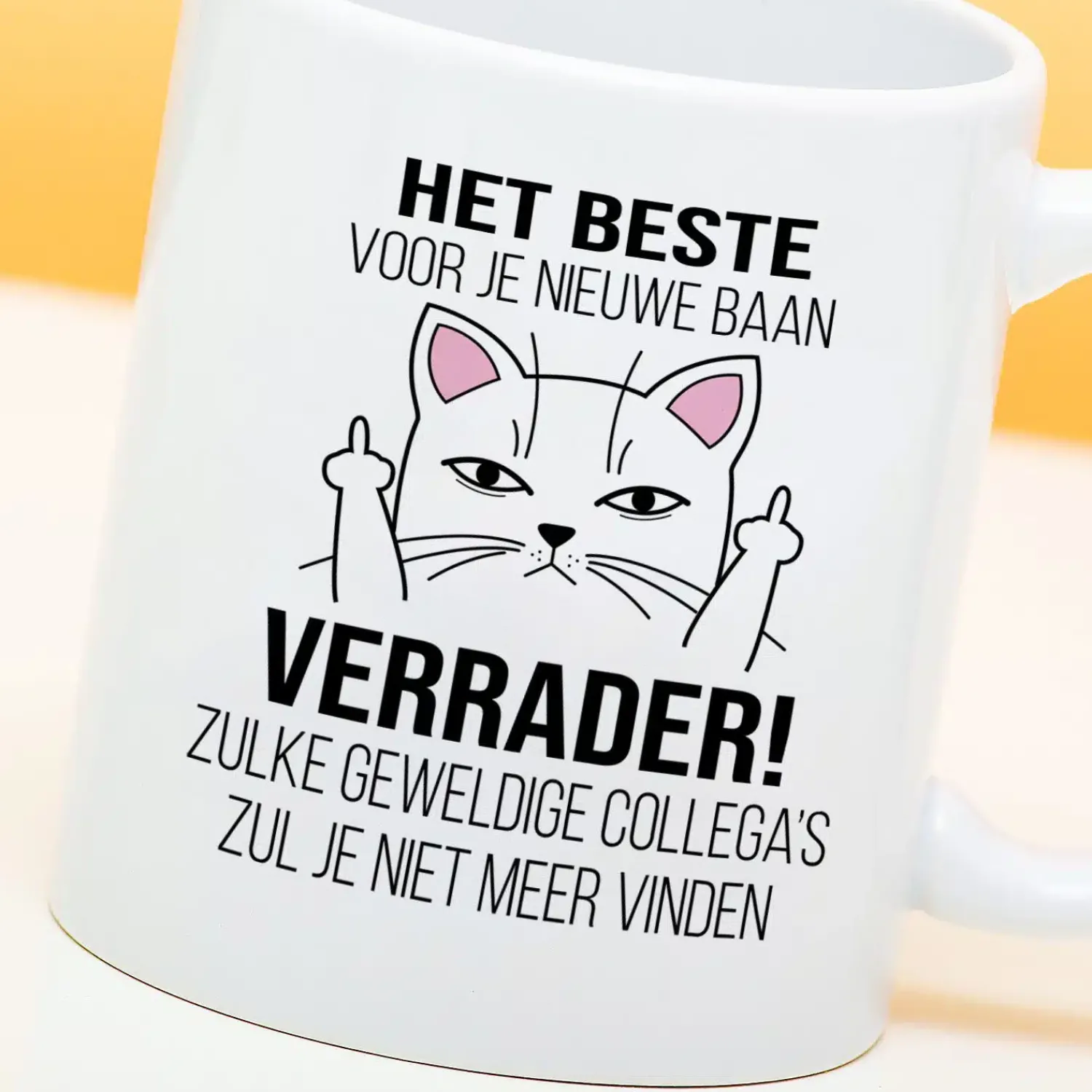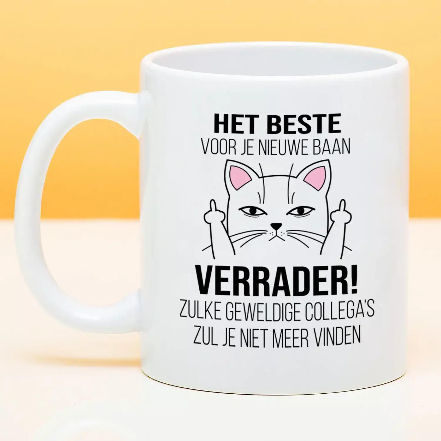 Je leukste collega heeft een nieuwe baan en dat vind je helemaal niet leuk. Met de Mok Het beste voor je nieuwe baan laat je dat duidelijk merken. De tekst op de mok begint vriendelijk, met de woorden: het beste voor je nieuwe baan. Maar daaronder staat de tekst: Verrader! Zulke geweldige collega’s zul je niet meer vinden. En oh ja, een illustratie van een kat die zijn middelvingers opsteekt.