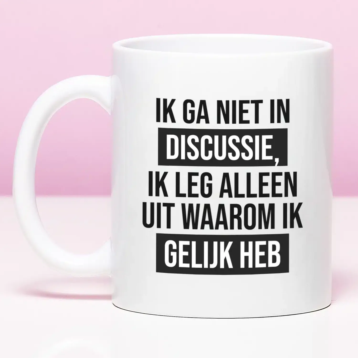 Voor een discussie moet je niet bij jou zijn. Jij weet prima dat je toch altijd gelijk hebt. De Mok Ik ga niet in discussie is daarom heel handig om dat duidelijk te maken. Op de mok staat de tekst: Ik ga niet in discussie, ik leg gewoon even uit waarom ik gelijk heb. Ideaal voor op het werk, maar ook voor thuis. Weet je geliefde ook direct waar hij aan toe is.