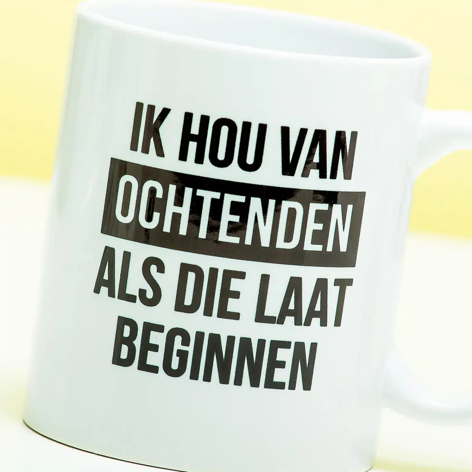 Jij bent dol op ochtenden. Op zaterdagochtend sta je altijd vroeg op bijvoorbeeld, om het meeste uit je dag te halen. De wekker gaat dan al om elf uur. Ja, jij bent een echt ochtendmens. Vervolgens drink je een kop koffie uit de Mok Ik hou van ochtenden als die laat beginnen. Een grappige mok, die je hebt gekregen van een vriend die jou heel goed kent.