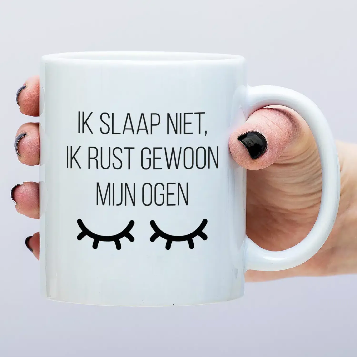 Af en toe is het goed om je ogen even rust te gunnen als je op school of aan het werk bent. En hoe kun je dat nou beter doen dan door ze te sluiten? De Mok Ik slaap niet zet je alvast naast je neer. Op deze grappige beker staat een afbeelding van twee gesloten ogen en de tekst: Ik slaap niet, ik rust gewoon mijn ogen. Dan weten mensen precies wat je aan het doen bent (en maken ze je niet wakker!).