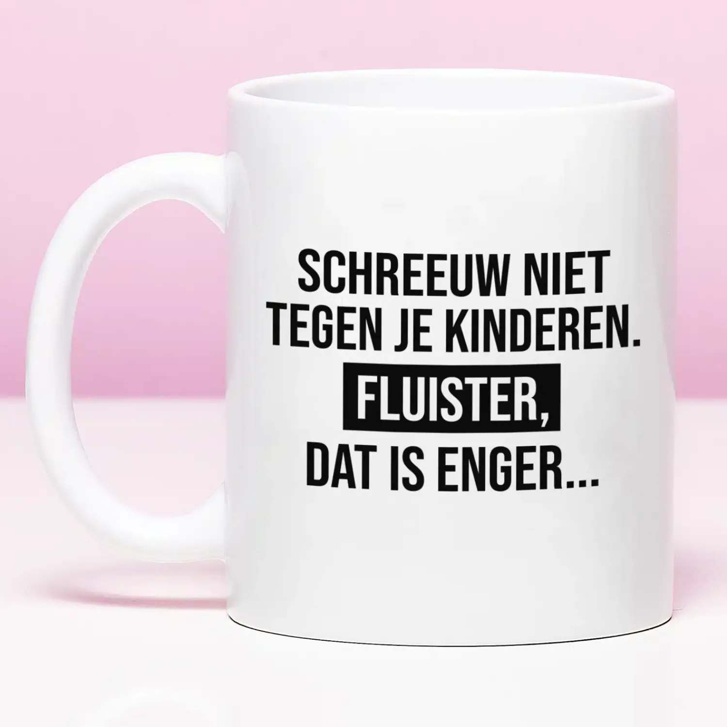 Iedere ouder kent het wel: kinderen die niet luisteren. Tegen ze schreeuwen helpt eigenlijk nooit. Maar weet je wat wel helpt? Fluisteren… Dat is ook de boodschap van de Mok Schreeuw niet tegen je kinderen. Op deze beker staat de tekst: Schreeuw niet tegen je kinderen. Fluister, dat is enger… Misschien houden ze zich voortaan een beetje in, als ze je ‘s ochtends koffie uit deze grappige koffiemok zien drinken.