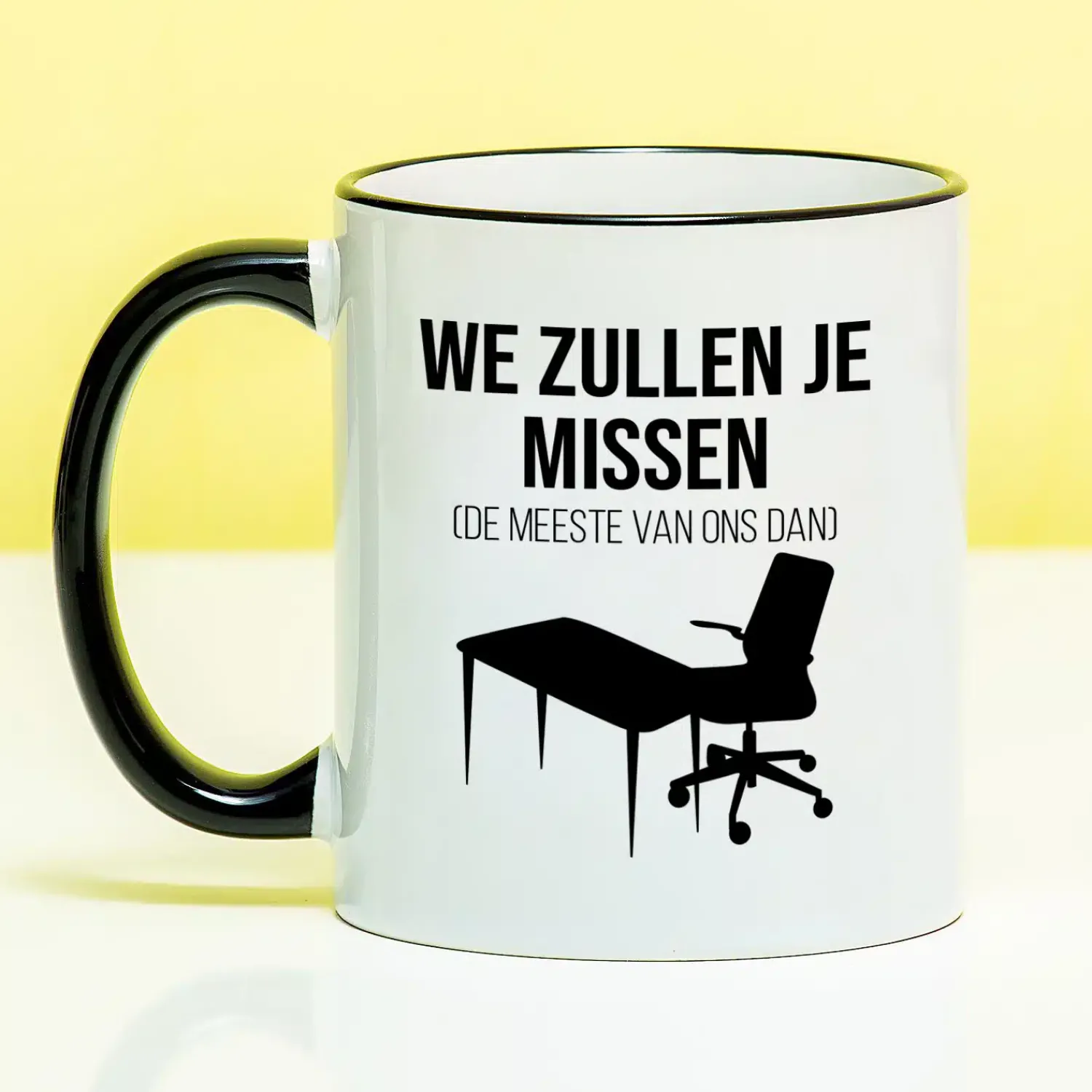 Het voelt een beetje zuur als je favoriete collega een nieuwe baan heeft. Daar past de Mok We zullen je missen goed bij. Op de mok staat een bureau en bureaustoel, plus de tekst: We zullen je missen (de meesten van ons dan). Zo kan de ontvanger nog eens aan je denken als diegene aan zijn nieuwe baan begonnen is.