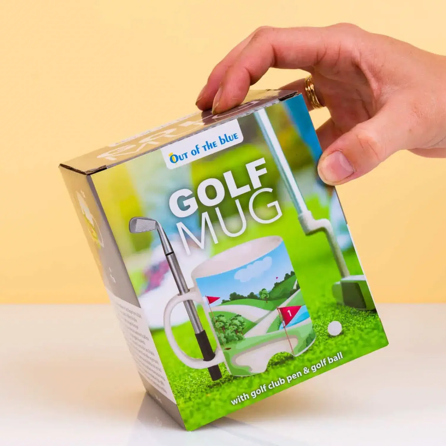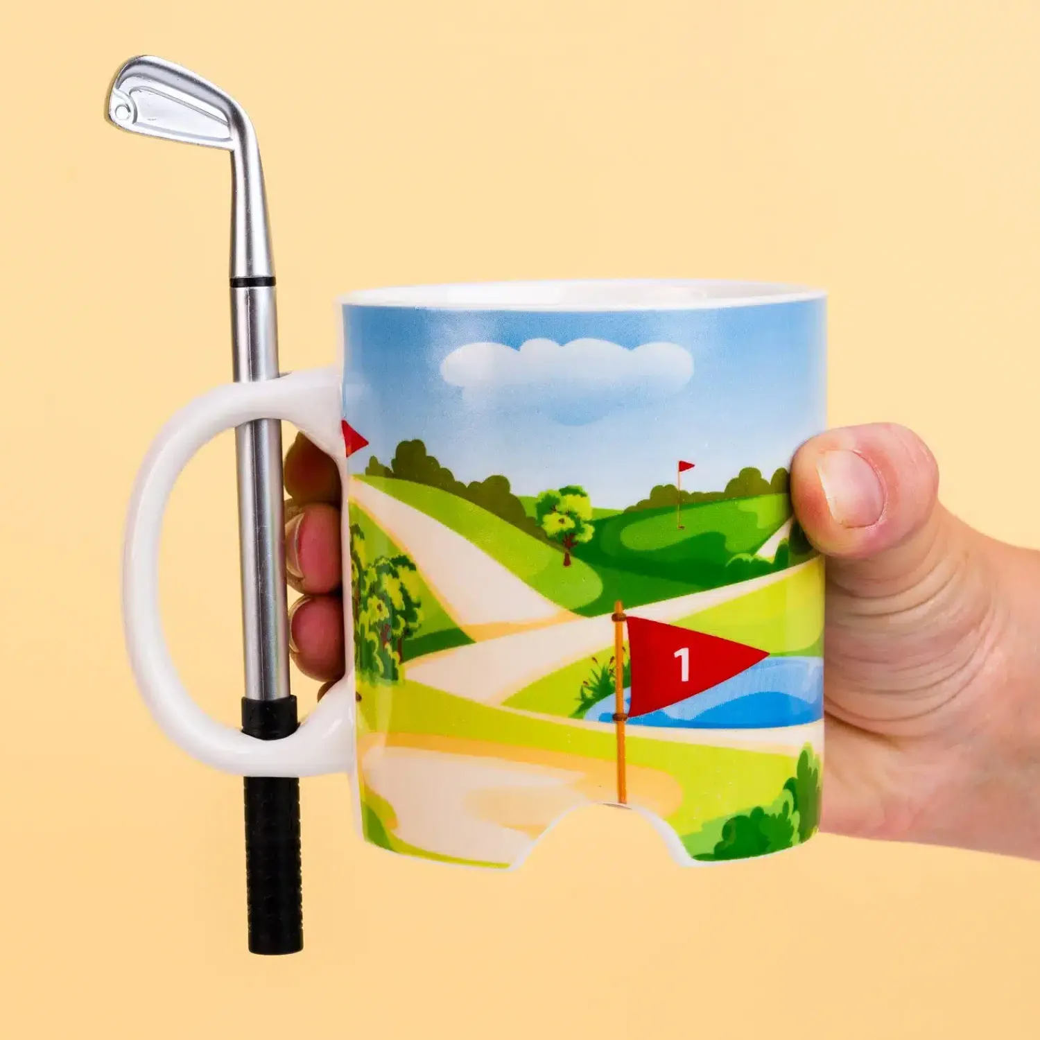 Hoe vaak je het ook hoopt, er lijkt maar geen eind te komen aan die saaie meetings op het werk. Gelukkig kun je de tijd doden met de Golf mok met golfclub en bal van Out of the Blue. Deze unieke koffiemok is voorzien van een heuse golfbaan! Hij komt met een golfclub en een balletje en het is natuurlijk de bedoeling dat je de bal in het gat slaat. En mocht je baas je opeens aankijken, dan ben jij gewoon druk aantekeningen aan het maken. De golfclub is namelijk ook een pen!