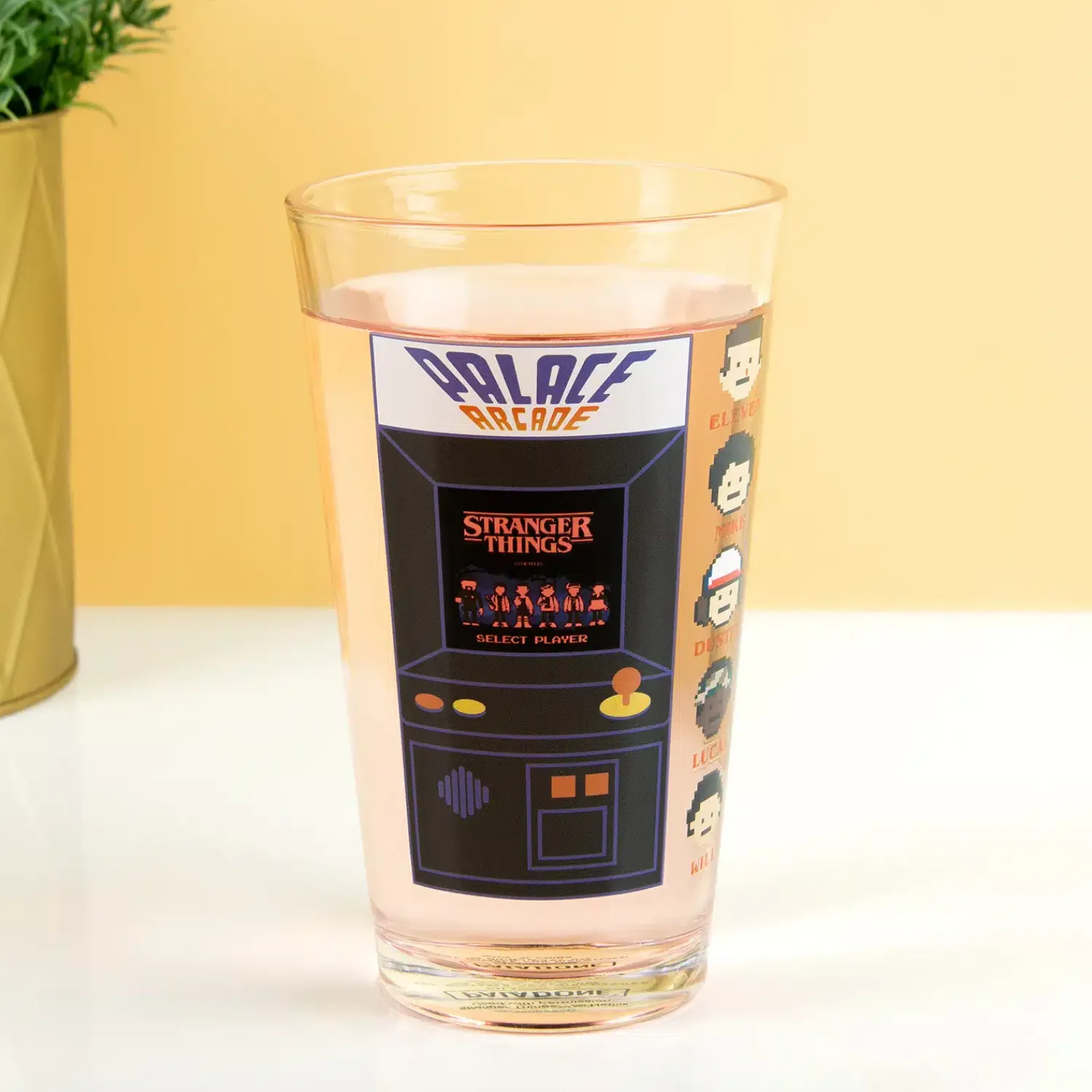 Jij houdt wel van een beetje gekkigheid als Stranger Things fan. Vandaar dat het Arcade koudegevoelig glas van Stranger Things niet in je keukenkastje mag ontbreken. Een uniek glas dat van kleur verandert als er een ijskoude drank in geschonken wordt. Het glas is voorzien van je favoriete karakters – Eleven, Mike, Dustin, Lucas, en Will – en een arcade spel. De letters van het spel veranderen van wit naar rood door de koude drank.