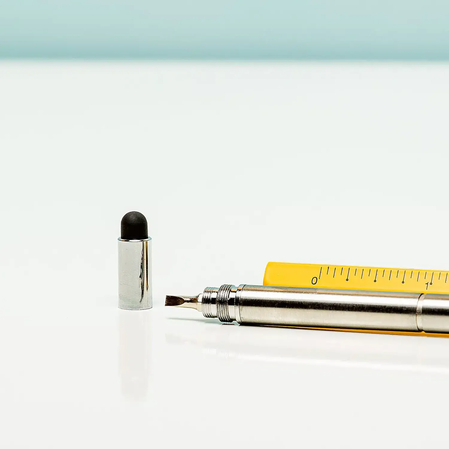- Met balpen, flesopener, schroevendraaiers, stylus, telefoonstandaard en liniaal