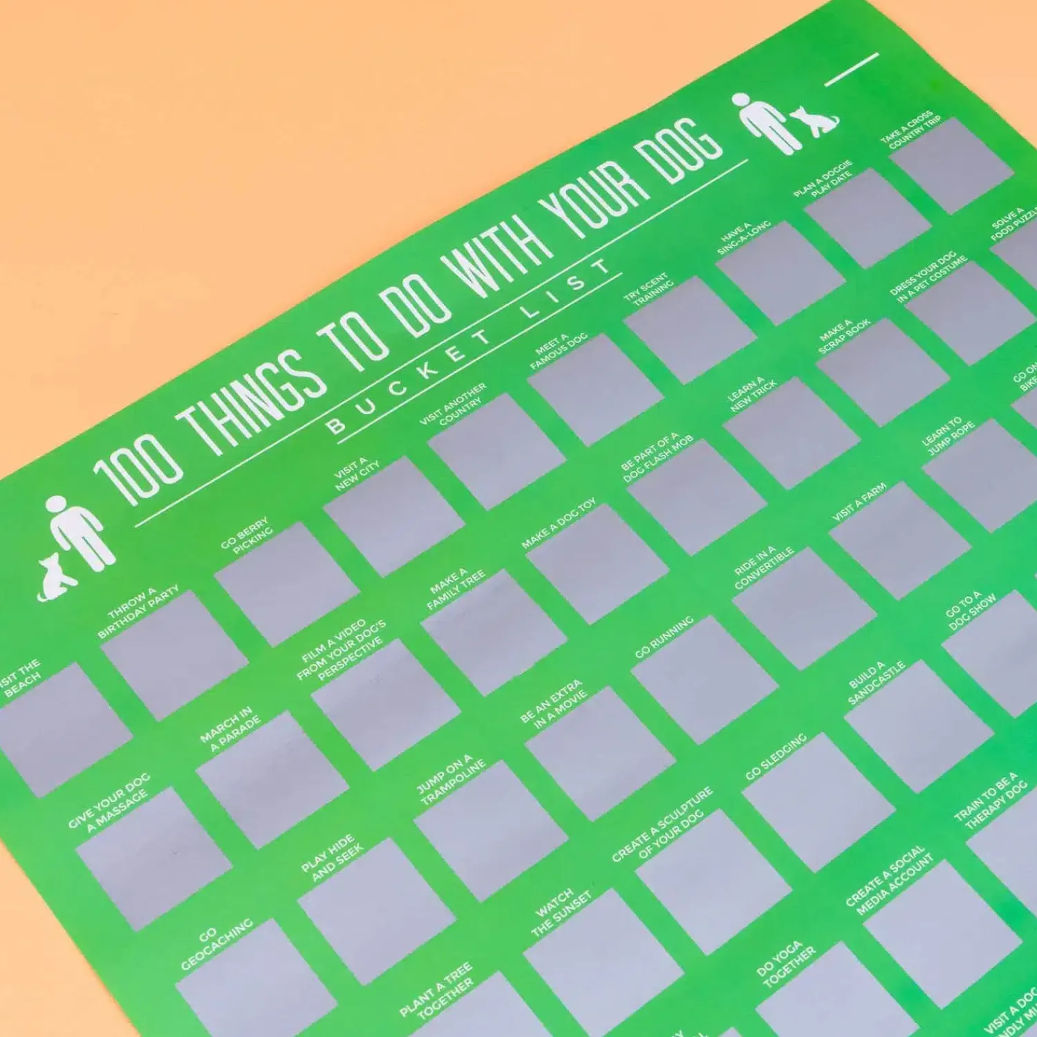 Samen sleeën, de zonsondergang bekijken of hondenkoekjes bakken: op de 100 Things to do with your dog krasposter van Gift Republic staan honderd bucketlist items om met je honden te doen. Heb je een activiteit gedaan? Dan kras je de zilverfolie van het bijbehorende vakje. Hieronder vind je een toepasselijke afbeelding. Zijn jij en je hond klaar om een wereldrecord te verbeteren?