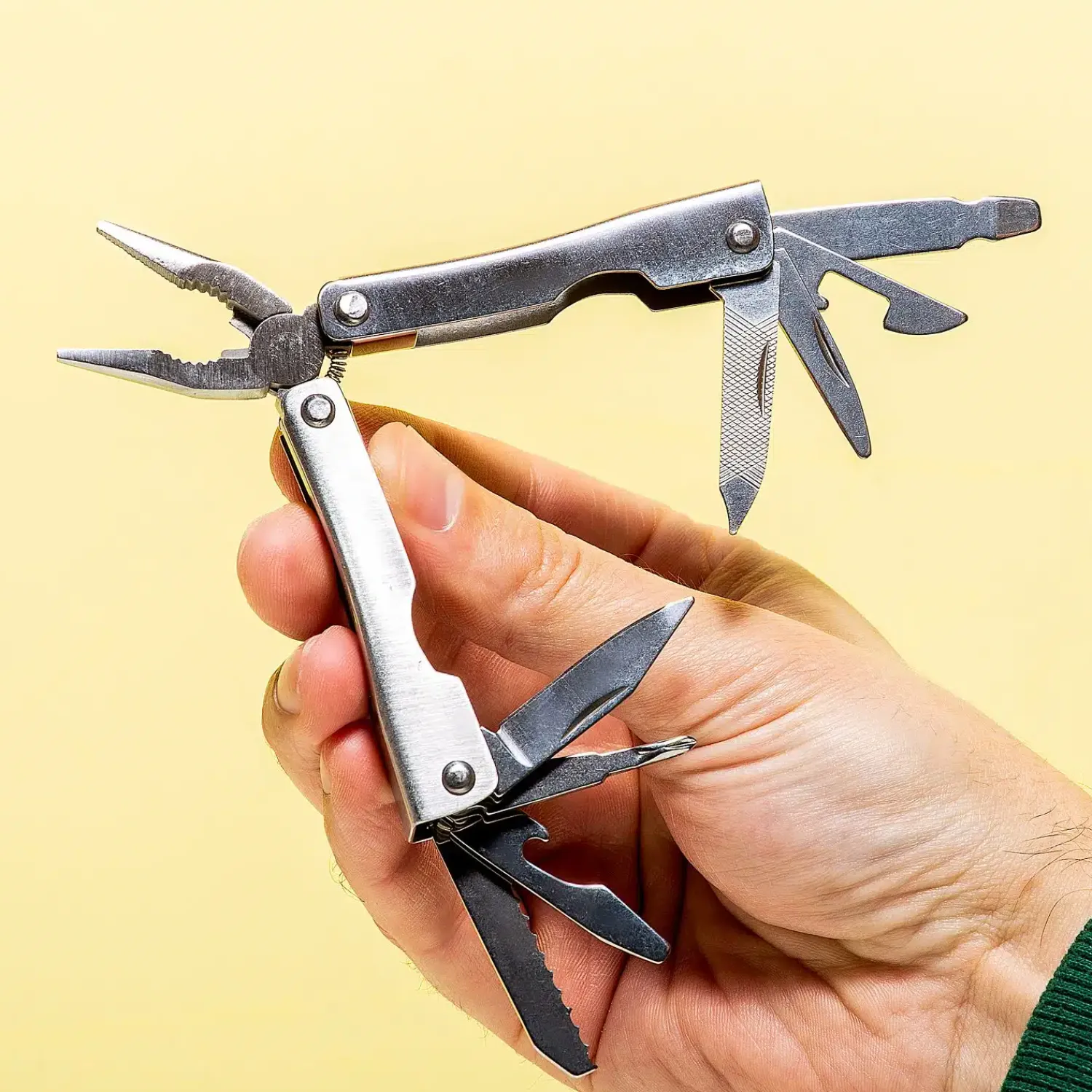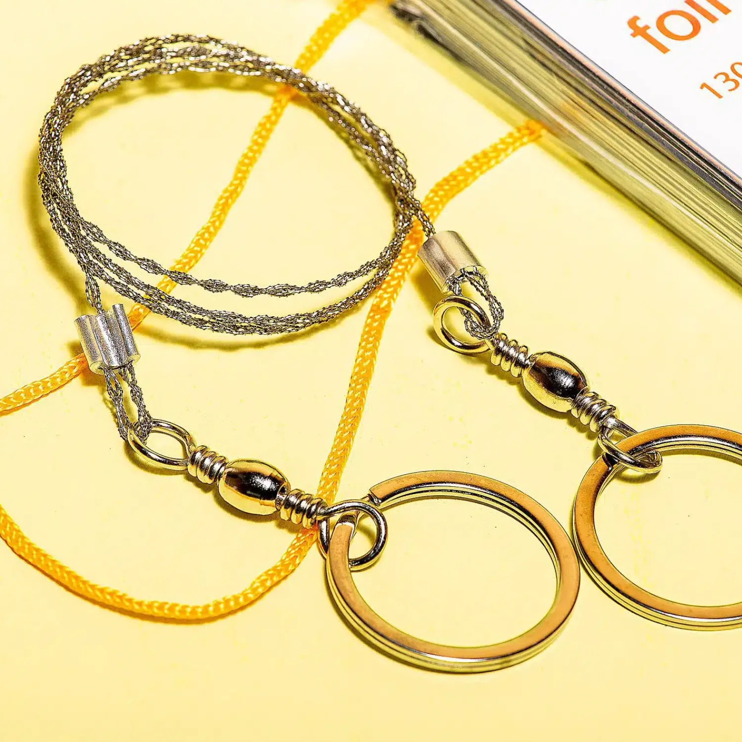 - Met een nooddeken, ijzerzaagdraad, 5-in-1 fluitje met kompas, oordopjes, potlood, waxinelichtje, vuursteen, scheermesje, multifunctioneel mes en vislijn