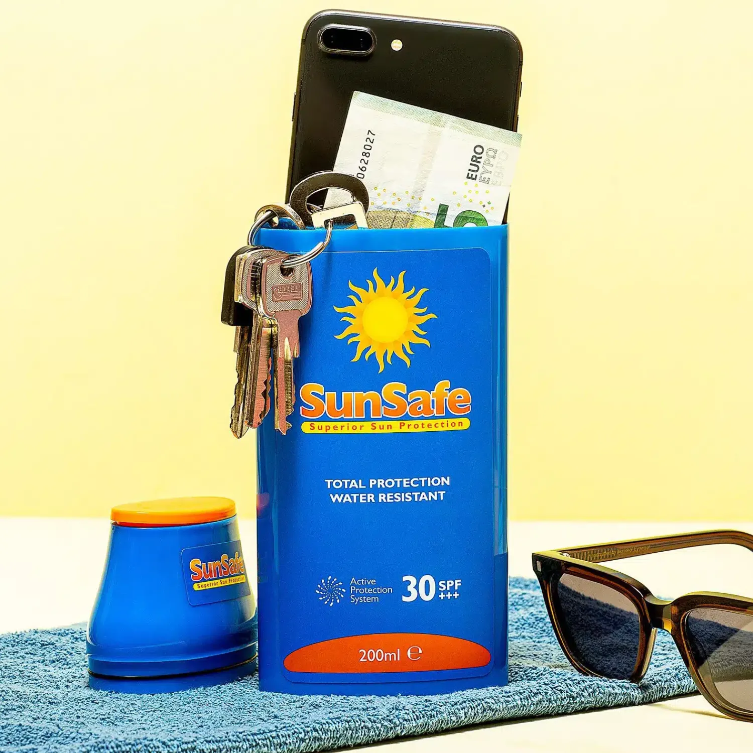 Je kent het vast wel: lig je lekker op het strand met je partner, willen jullie samen even zwemmen. Maar wie gaat er dan op de spullen letten? Of je neemt de gok en laat je telefoon, sleutels en geld gewoon in de tas zitten of er zit niks anders op dan om beurten een frisse duik te nemen. Met de Zonnebrandcrèmefles voor spullen is dat verleden tijd. In deze holle fles zonnebrandcrème kun je je kostbaarheden opbergen, zonder dat iemand het weet: hij lijkt namelijk op een fles zonnebrandcrème. Niks geks dus, want wie neemt dat nou niet mee naar het strand? In werkelijkheid kun je in de lege tube je pinpas, geld, smartphone en autosleutels opbergen. Geen enkele dief die het in z’n hoofd zal halen om een tube zonnebrandcrème te jatten, toch?