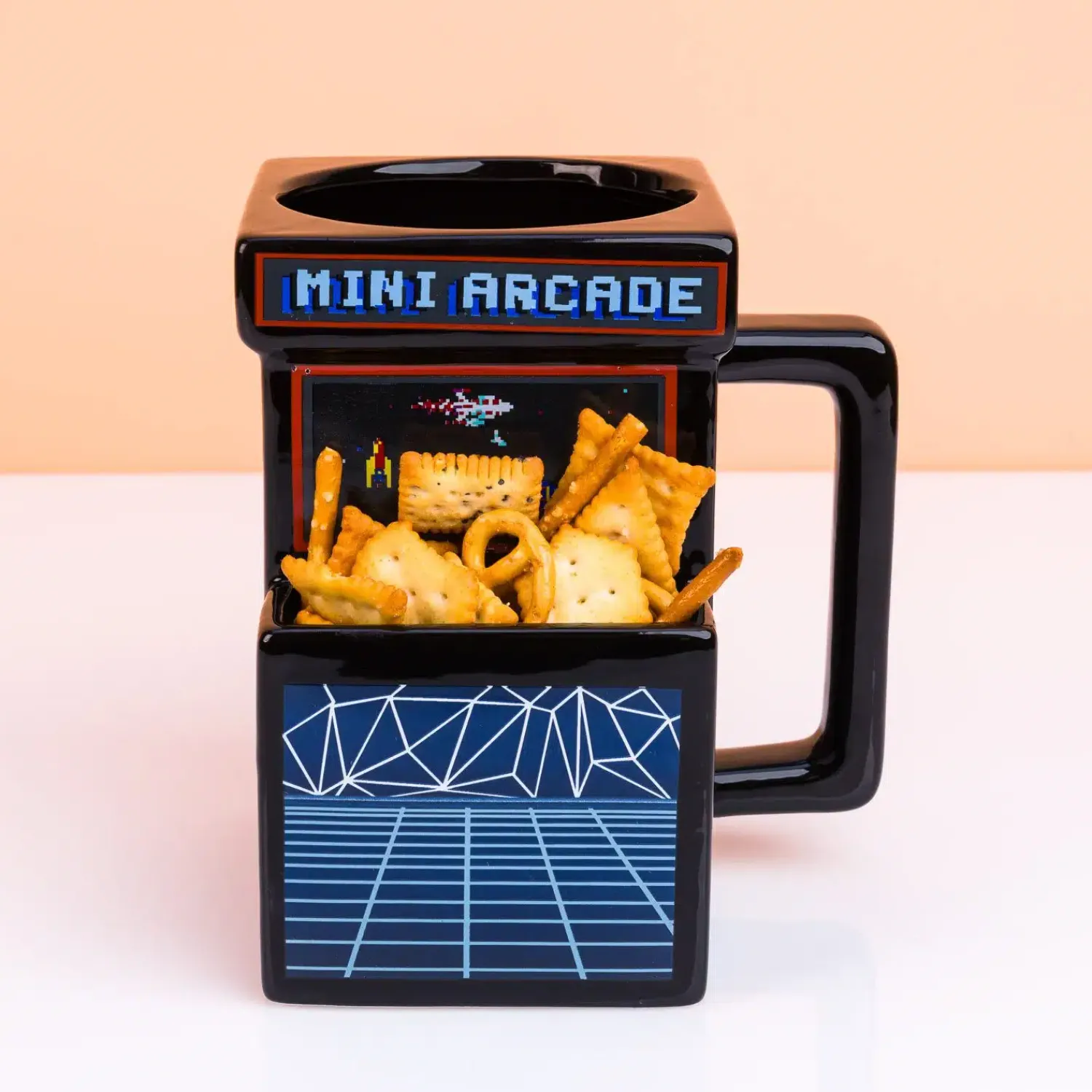 Waarom zou je koffie uit een gewone beker drinken, als het ook uit een ouderwetse arcade game kan? Ok, we beseffen dat dit een lastige vraag is. Mocht je nou toch de kriebels krijgen of denken: hoe dan? Kijk dan eens naar de XXL Retro Arcade mok van Out of the Blue. Deze unieke beker ziet eruit als een spel uit een arcade, maar dan een stuk kleiner! Hoewel… met een inhoud van 930 milliliter kun je deze mok zeker geen kleintje noemen.