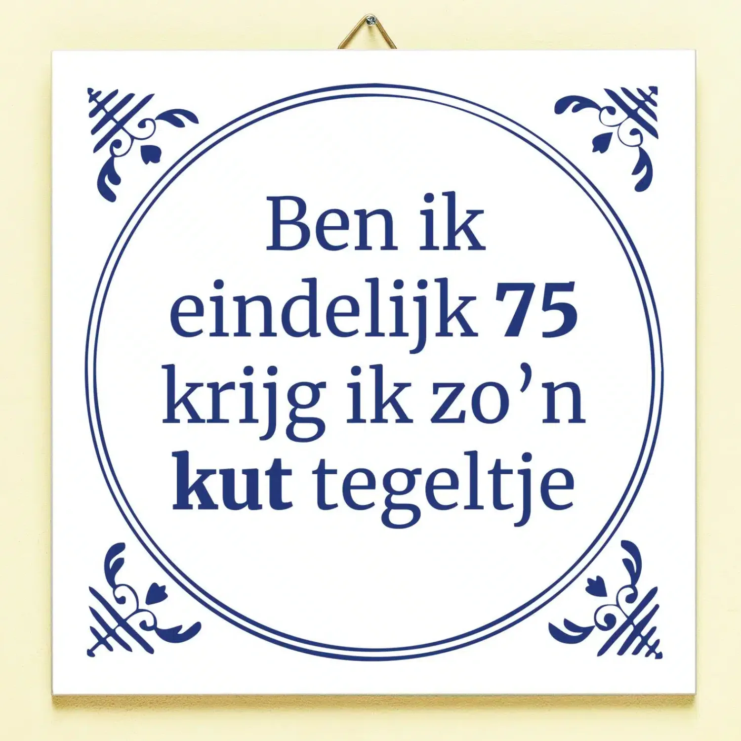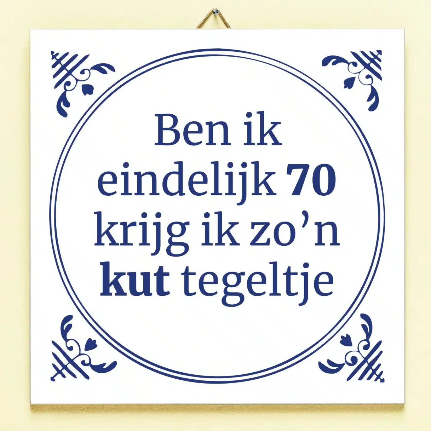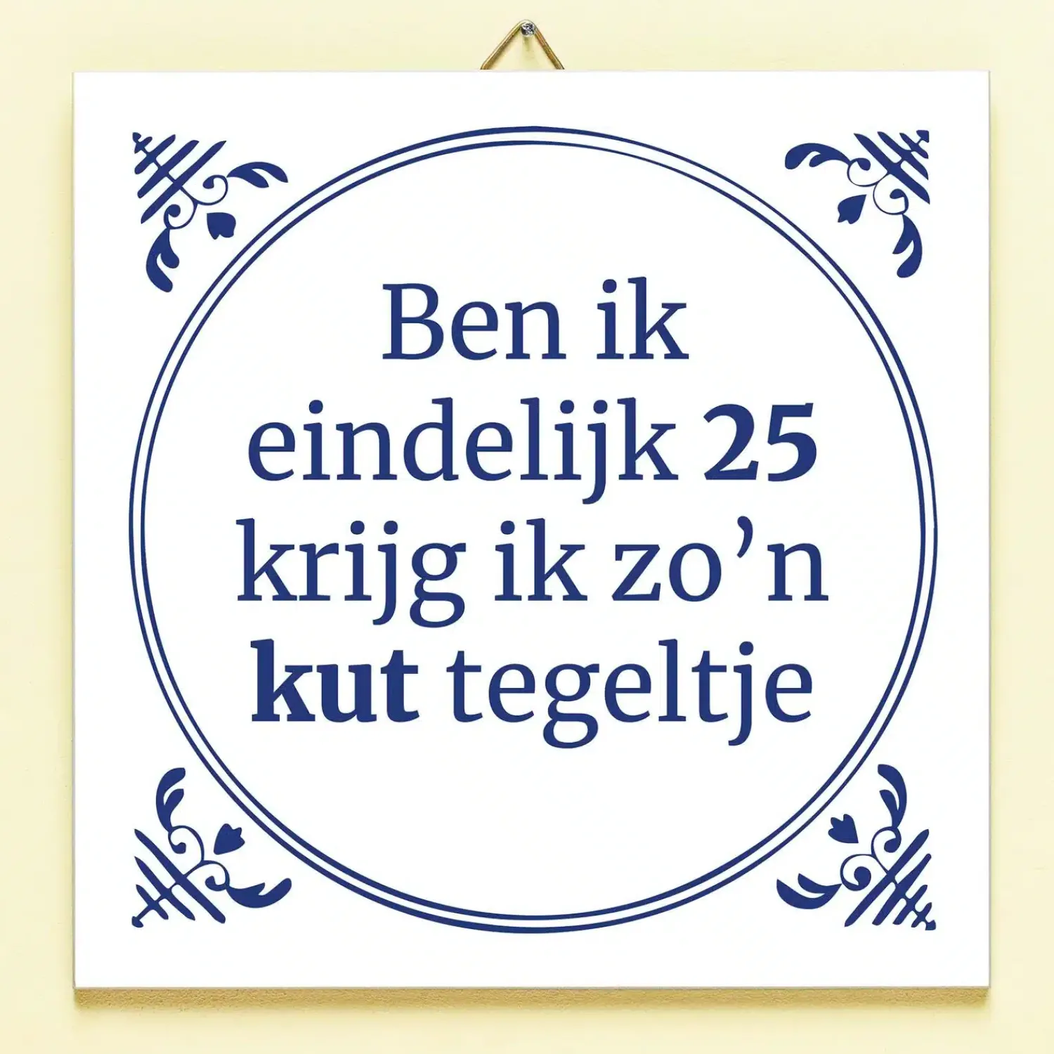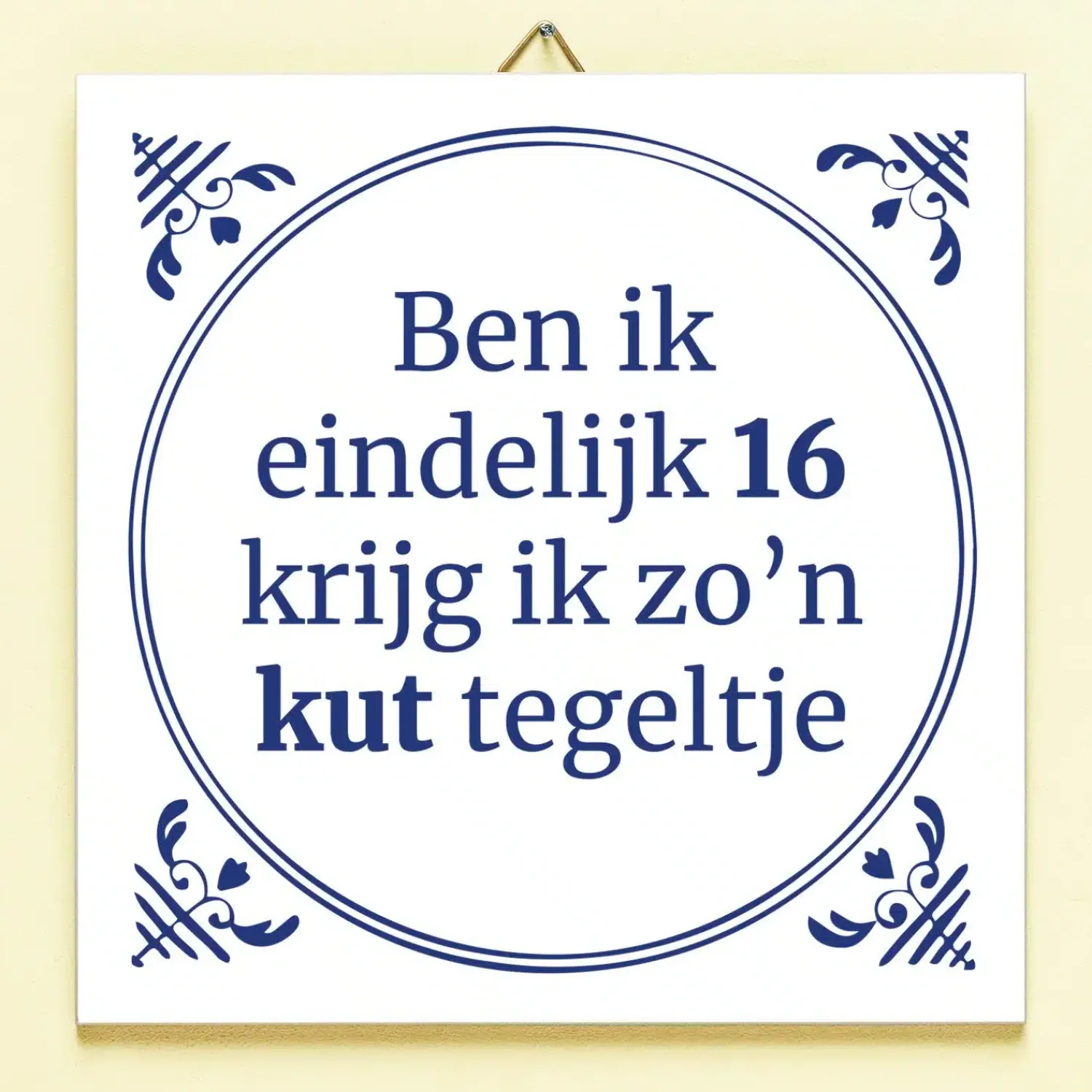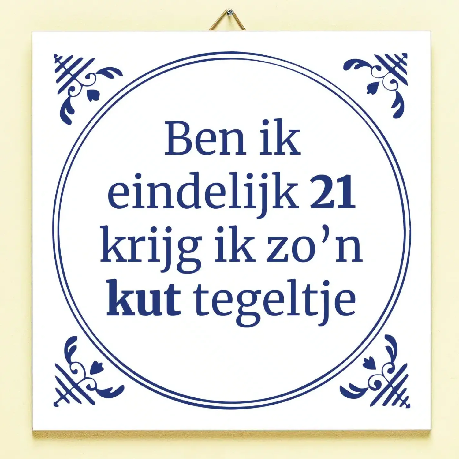 Je hebt maanden naar je verjaardag uitgekeken: een mijlpaal dit jaar nog wel. Vol spanning pak je je cadeautje uit en is het… zo’n kut tegeltje. Plaag de jarige door hem of haar het Tegeltje Ben ik eindelijk jarig te geven. Het keramische tegeltje heeft een Delfts blauw design en de tekst: Ben ik eindelijk (leeftijd), krijg ik zo’n kut tegeltje. Deze grappige tegel is leverbaar in verschillende leeftijden en komt met een tegelhaakje, zodat hij ook opgehangen kan worden.