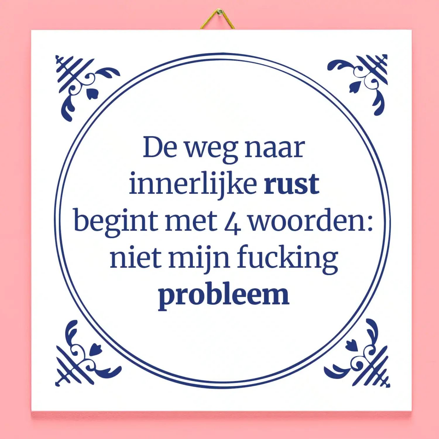 Jij bent helemaal zen en iedereen wil weten hoe dat kan. Het Tegeltje De weg naar innerlijke rust verklapt je geheim. Op het tegeltje staat de tekst: De weg naar innerlijke rust begint met 4 woorden: niet mijn fucking probleem.