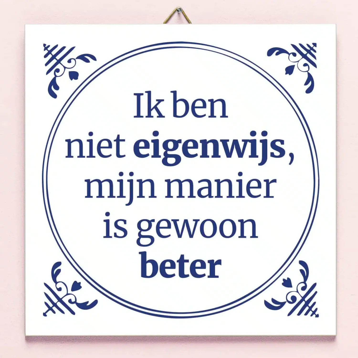 Eigenlijk weet je het al als iemand zegt: Ik ben niet eigenwijs hoor. Het zijn uitsluitend stronteigenwijze mensen die dit met droge ogen durven te beweren. Het Tegeltje Ik ben niet eigenwijs… is daarom het perfecte cadeautje voor diegene. Op dit grappige, op Delfts blauw geïnspireerde tegeltje staat de tekst: Ik ben niet eigenwijs, mijn manier is gewoon beter. Grappig voor dat betweterige familielid of die irritante collega die alles beter weet.