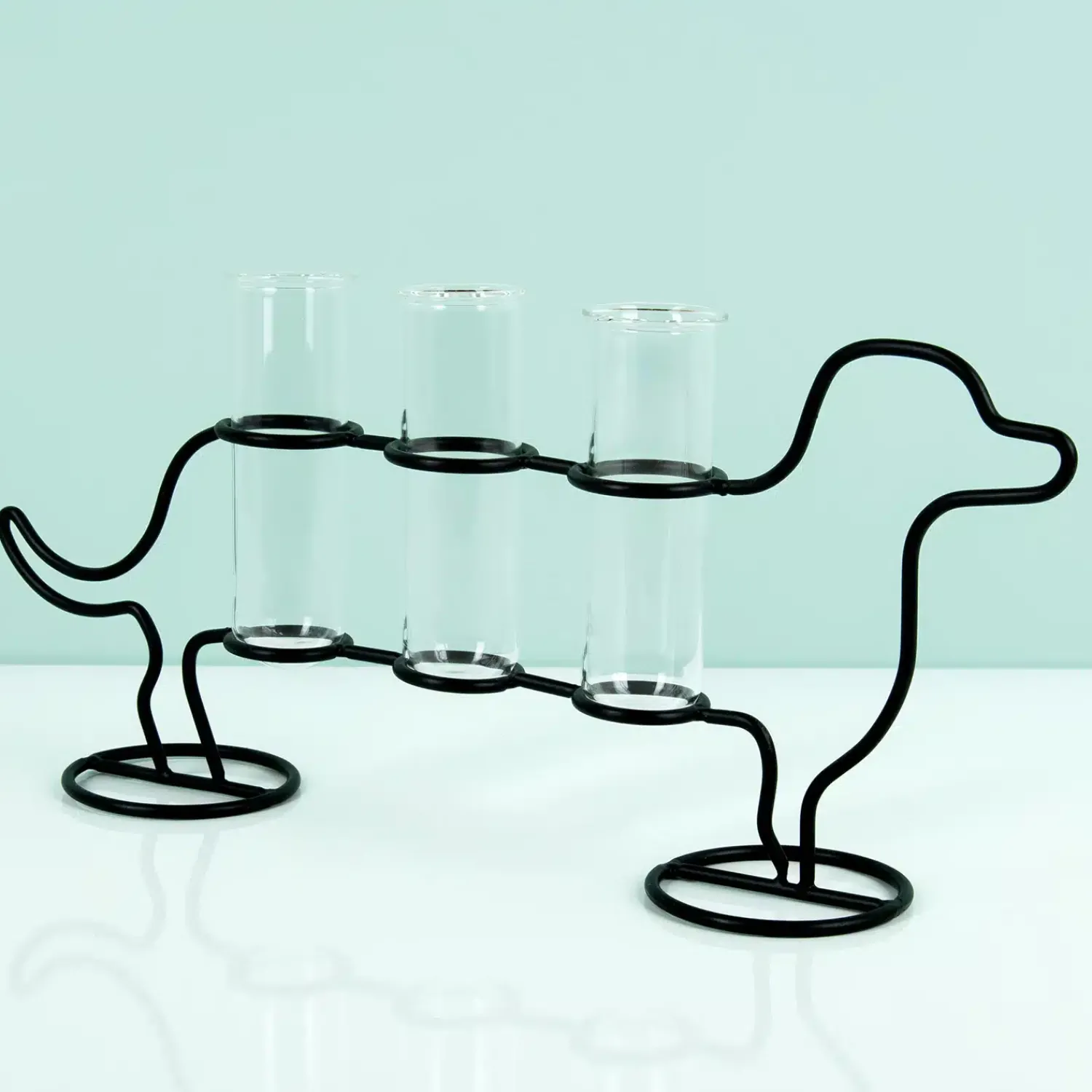 Ben je dol op grappige woonaccessoires en dieren? Dan is de Hond draadvaas van Kikkerland echt iets voor jou! Deze grappige draadvaas ziet eruit als een getekende teckel. Door het gebruik van zwart ijzerdraad spelen je hersenen een spelletje met je. Maar wees gerust: de teckel is echt voorzien van vaasjes. Deze reageerbuisvaasjes zijn geschikt voor losse bloemen en om stekjes te laten wortelen bijvoorbeeld.