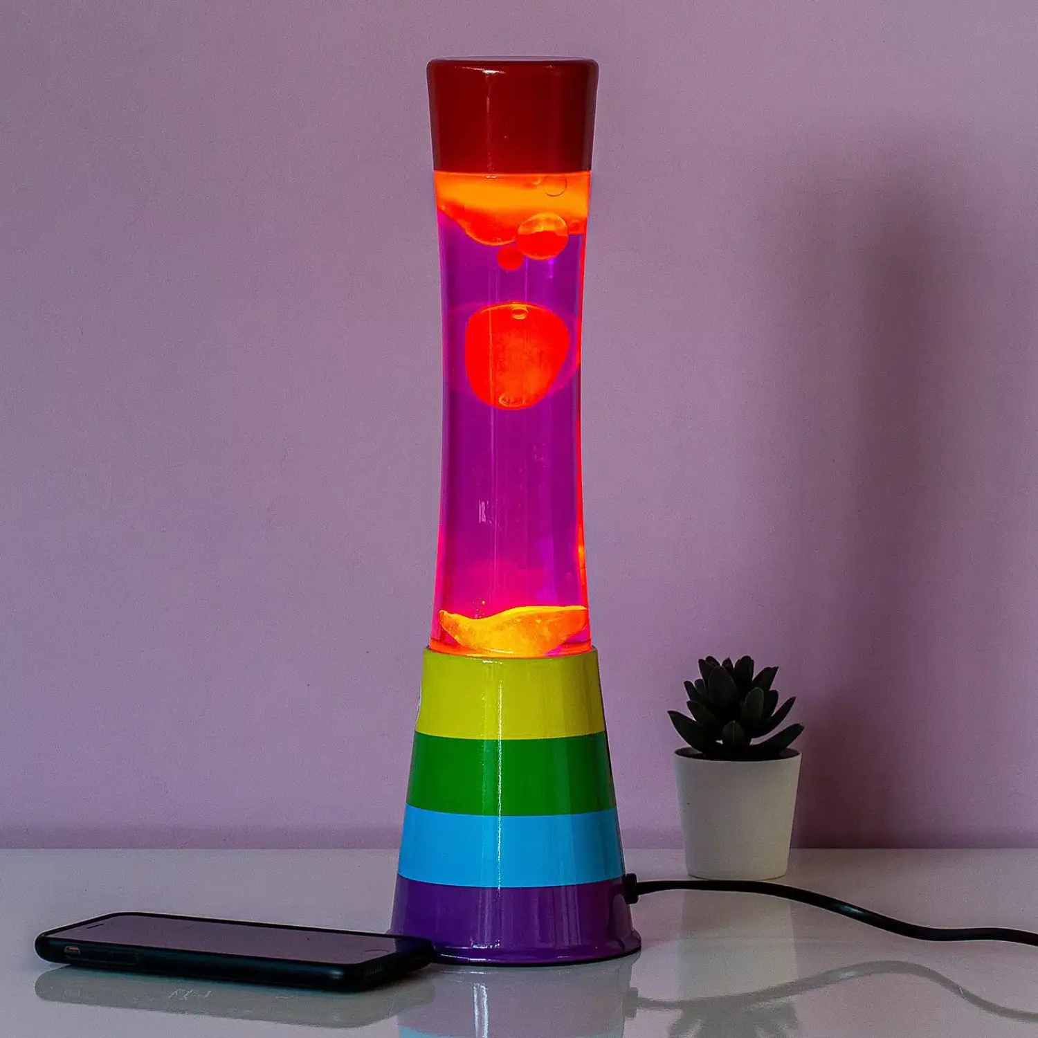 Als jij nooit genoeg kleur in huis kunt hebben, dan is de Regenboog lavalamp van Fisura een perfecte eyecatcher voor in jouw interieur. Deze bontgekleurde lamp heeft een basis in de kleuren van de regenboog: rood, geel, groen, blauw en paars. Daarnaast heeft hij oranje lava, die door een roze vloeistof bubbelt. Het is ongetwijfeld de vrolijkste lavalamp die je zult vinden.