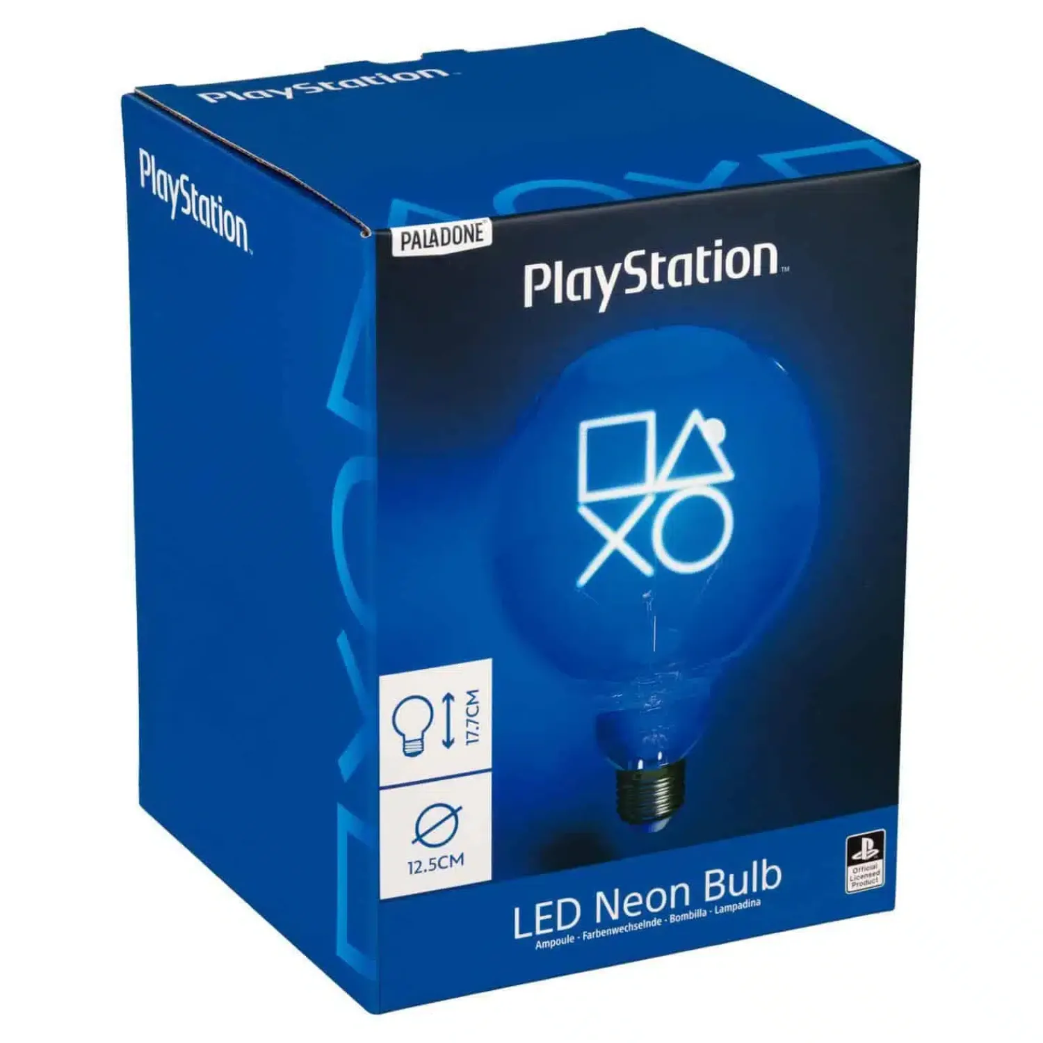 Met de PlayStation icoon LED-lamp (E27 fitting) breng je jouw favoriete console tot leven. Het filament in de vorm van de PlayStation-iconen geeft een blauwe gloed en past in een standaard E27 fitting. Een stoere eyecatcher en het perfecte cadeau voor gamers.