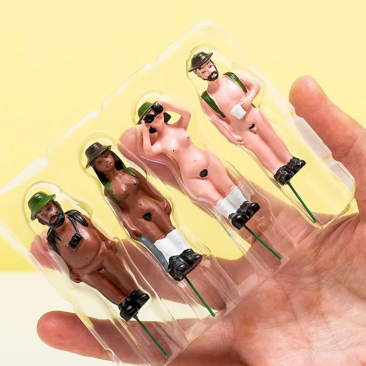 Wat staat daar nou achter je pannenkoekenplant? Het is één van de Bloempot naturisten (set van 4) van Gift Republic! Deze grappige minifiguurtjes zien eruit als naturisten. Ze zijn helemaal bloot, op een stel verstandige schoenen, hoed en verrekijker na. De set heeft vier verschillende figuurtjes: je prikt ze eenvoudig in je bloempotten om deze op te vrolijken.