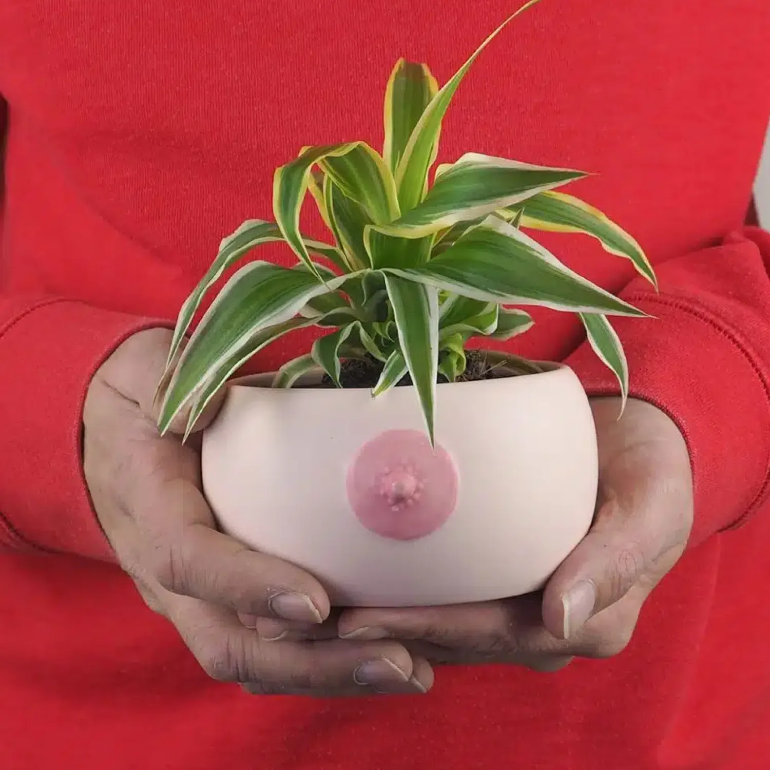 Een schaal met Engelse drop in de vorm van een borst met gezellige roze tepel. Of een borst bloempot met een plantje erin. Wat zie jij in de Borst kom van Bitten? De kom is een ode aan de vrouwelijke vorm en onderdeel van de Boob collection. Zet de kom in de vorm van een borst in je woonkamer met een plant erin. Of gebruik hem om koekjes of chips in te serveren. Je kunt hem voor de gein ook cadeau geven aan je totaal niet preutse vriendin. De kom is gemaakt van keramiek.