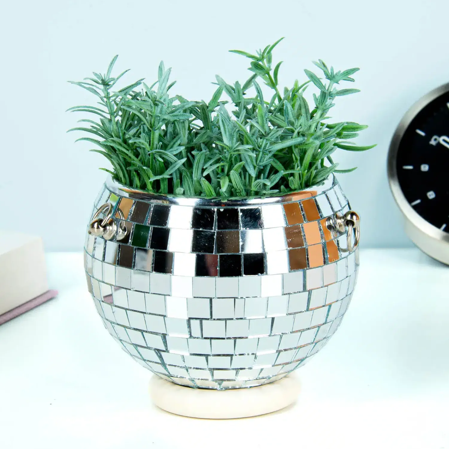Wil je je kamerplanten een upgrade geven? De Discobal bloempot van Winkee is een zilverkleurige ronde bloempot met spiegeltjes die eruitziet als een discobal. Je kunt hem ophangen aan de ketting of neerzetten op de standaard. Perfect voor kleine plantjes: hij geeft je kamer instant disco-vibes. Een feestelijk cadeau voor plantenliefhebbers!