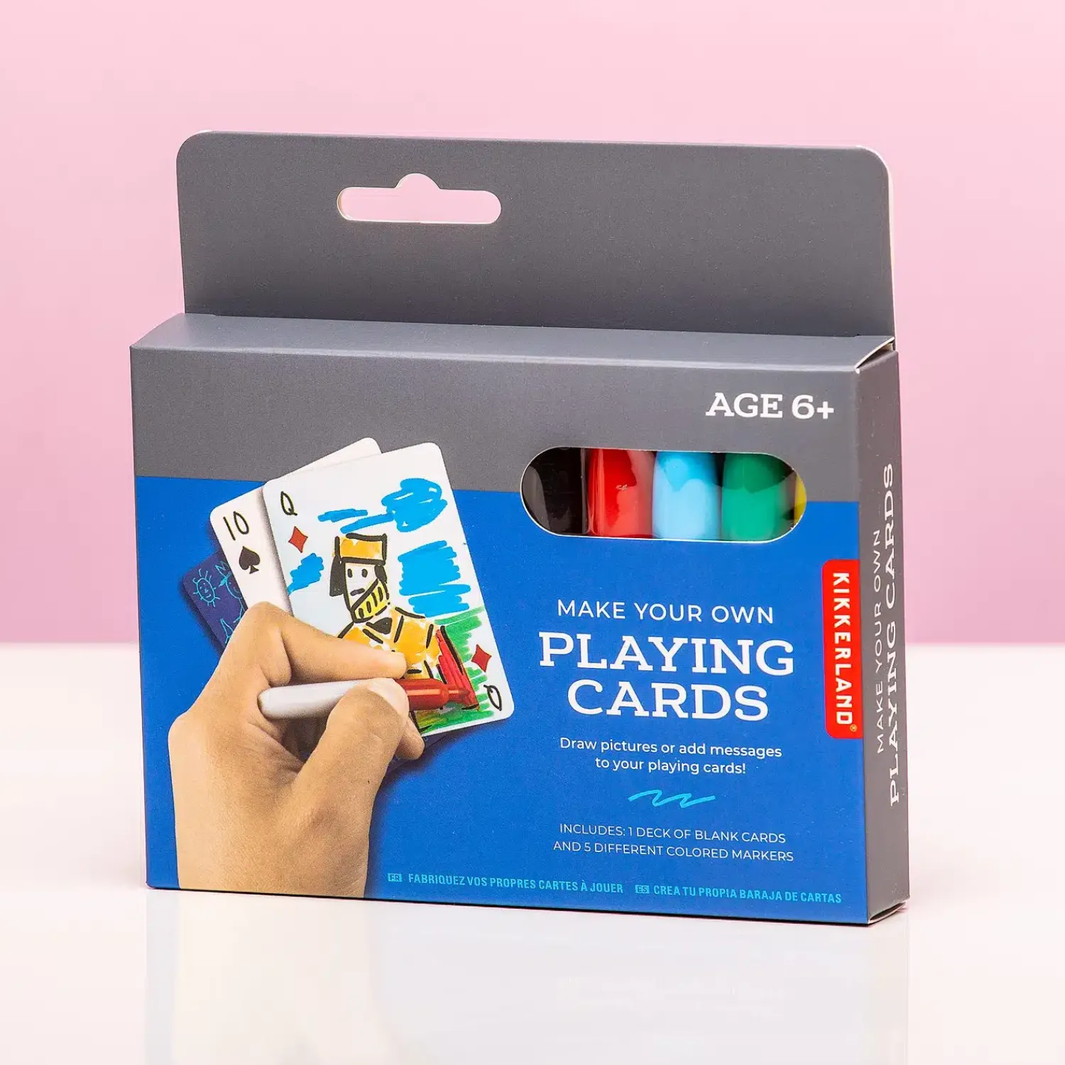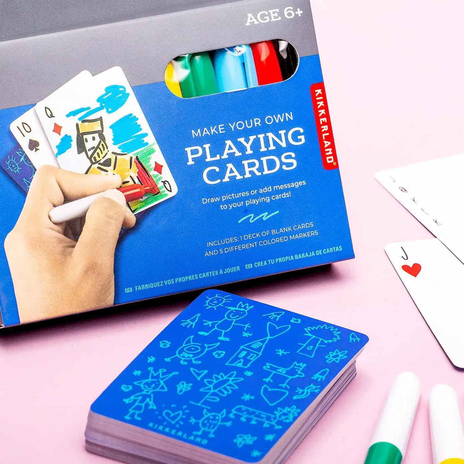 Heb jij een creatieve insteek? Verras je vrienden dan door tijdens een spelletjesavond het DIY kaartspel van Kikkerland op tafel te toveren. Deze set met speelkaarten ontwerp je helemaal zelf. Bij de kaarten ontvang je een rode, blauwe, gele, groene en zwarte stift, waarmee jij je kaartspel kunt ontwerpen. Het kaartspel heeft wel alle waardes die bij een kaartspel horen in de hoeken staan: zo weet je zeker dat je straks geen kaarten mist.
