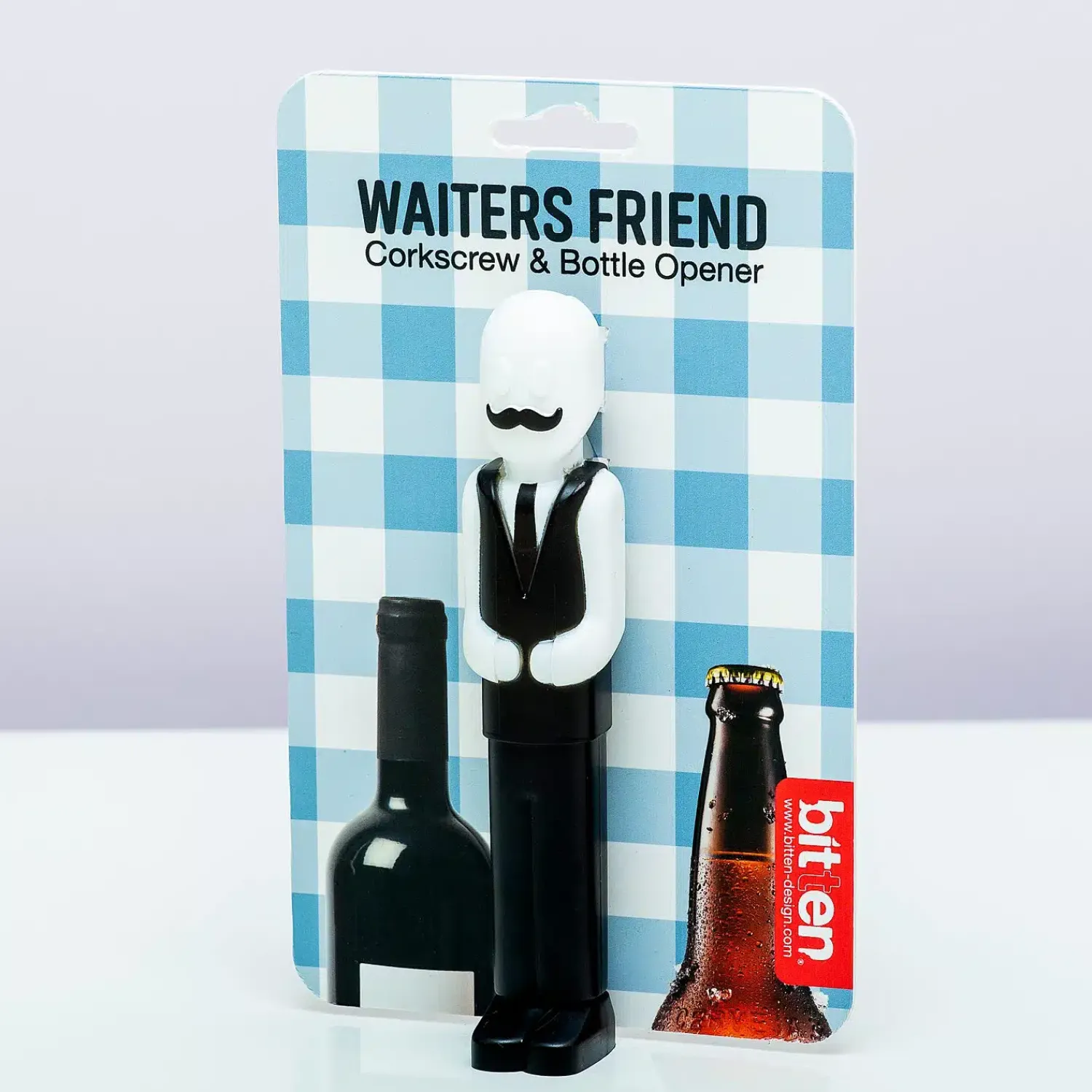 Zoals je mag verwachten van iemand in de bediening, staat de Ober kurkentrekker van Bitten altijd voor je klaar om te helpen. Of je nu een flesje wijn wilt opentrekken of dat het tijd is voor een biertje, hij helpt je graag. Deze originele kurkentrekker ziet eruit als een ober in een chique restaurant. Zelfs zijn snor zit helemaal perfect op zijn plek! Een origineel cadeautje voor iemand die graag een drankje drinkt.