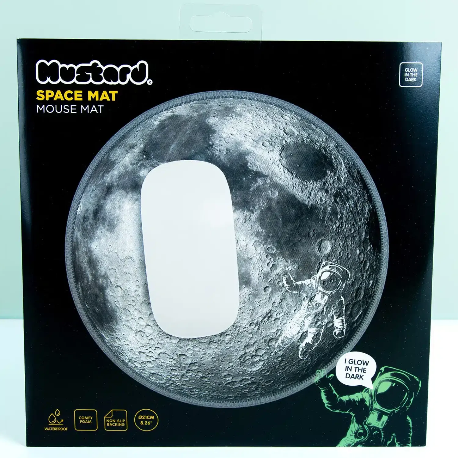 Muismatten zien er vaak een beetje saai uit, maar wij hebben er één die echt cool is: de Maan muismat van Mustard. Deze unieke muismat ziet eruit als de maan! Maar dat is niet het enige: er zweeft ook een glow in the dark astronaut voor de maan. Als deze is opgeladen door zonlicht of het licht van een bureaulampje, dan geeft hij licht in het donker.