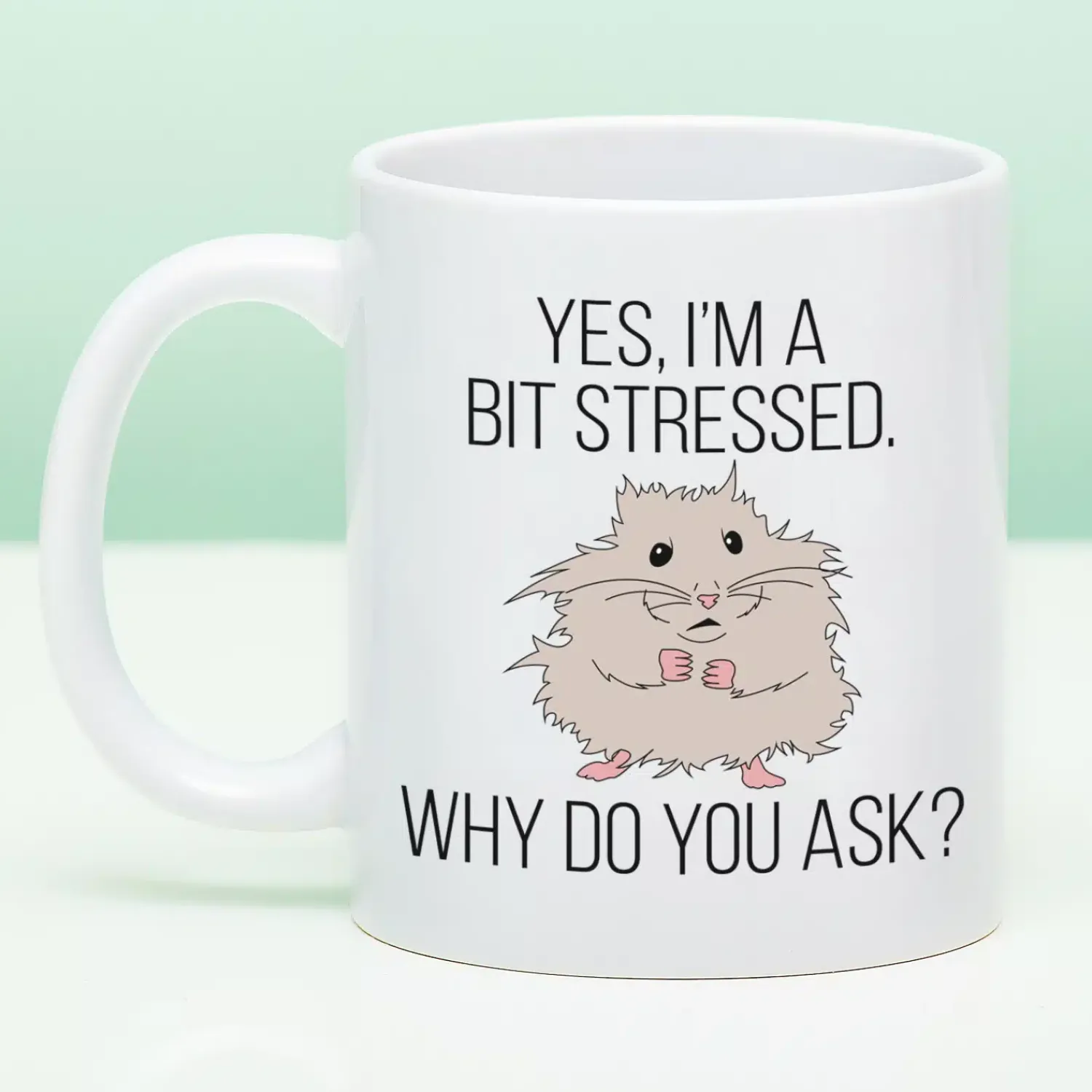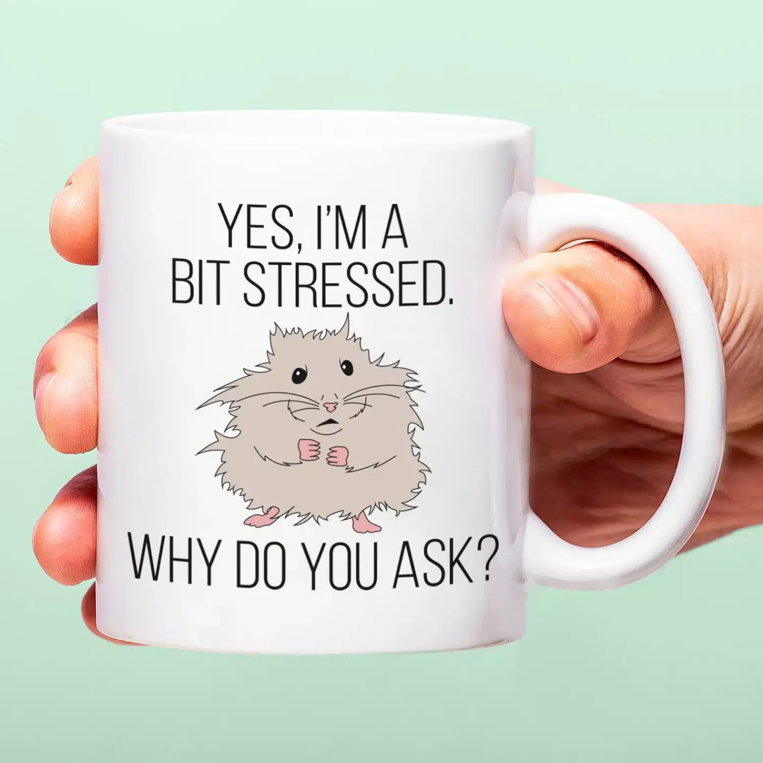 Wil je je gestresste collega helpen te ontspannen? Misschien lukt dat met de Mok A Bit Stressed. Op deze mok staat een zeer gestresste muis: zijn vacht staat alle kanten op. Verder staat er op de mok deze tekst: Yes, I’m a bit stressed. Why do you ask? Hopelijk zorgt deze schattige muis voor een glimlach op het gezicht van je collega.